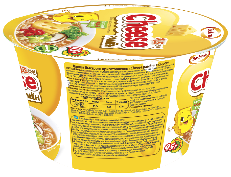 Лапша: пшеничная мука высший сорт, модифицированный картофельный крахмал, растительное масло, соль, клейковина, пищевая добавка эмульгатор Seasoning sauce wi К-300А, комплексная пищевая добавка стабилизатор премикс, приправы смешанные (сахар, экстракт дрожжей, растительный протеин, лук, порошок соевого соуса). Бульон-приправа: бульонная основа (молоко сухое, сырный порошок, заменитель сливок на растительной основе, ароматизатор сыр, перец черный), соль, усилитель вкуса (глутамат натрия), сахар. Приправа сырная: сыворотка молочная, мальтодекстрин, сырный порошок, сахар, соль, ароматизатор сыр. Приправа из сушеных овощей: капуста, морковь, лук.