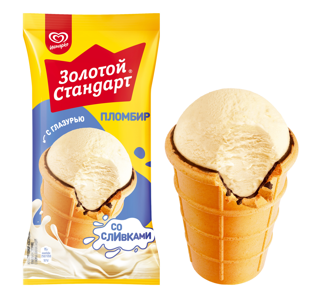 Мороженое пломбир Золотой стандарт со сливками в вафельном стаканчике, 95г