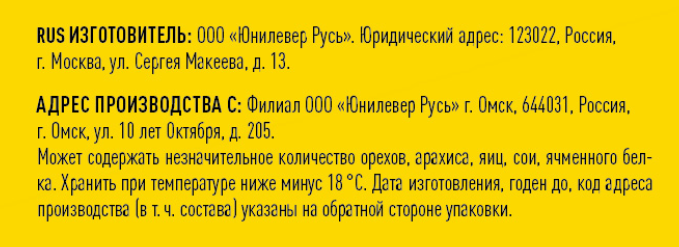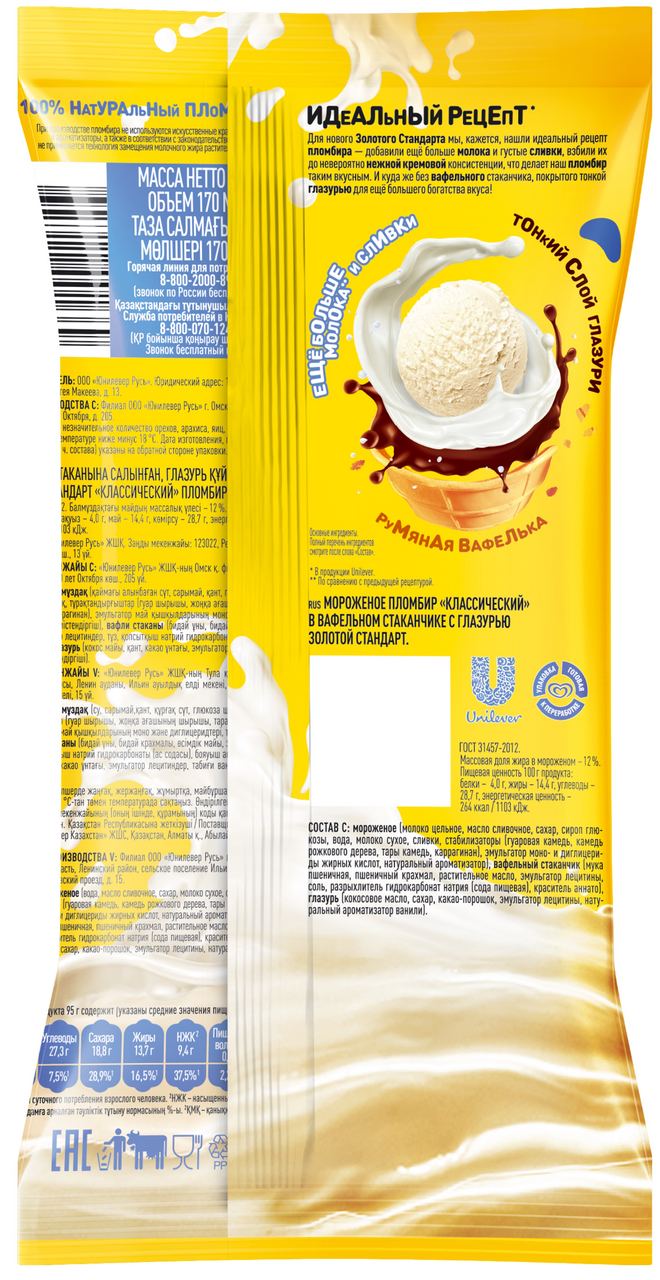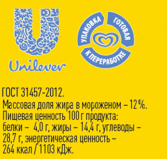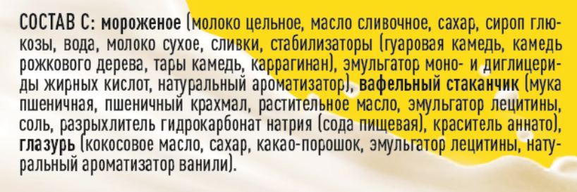 Состав С: мороженое молоко цельное, масло сливочное, сахар, сироп глюкозы, вода, молоко сухое, сливки, стабилизаторы гуаровая камедь, камедь рожкового дерева, тары камедь, каррагинан, эмульгатор моно- и диглицериды жирных кислот, натуральный ароматизатор, вафельный стаканчик мука пшеничная, пшеничный крахмал, растительное масло, эмульгатор лецитины, соль, разрыхлитель гидрокарбонат натрия сода пищевая, краситель аннато, глазурь кокосовое масло, сахар, какао-порошок, эмульгатор лецитины, натуральный ароматизатор ванили. Состав V: мороженое вода, масло сливочное, сахар, молоко сухое, сироп глюкозы, сливки, стабилизаторы камеди гуаровая, рожкового дерева, тары, каррагинан, стабилизаторы гуаровая камедь, камедь рожкового дерева, тары камедь, каррагинан, эмульгатор моно- и диглицериды жирных кислот, натуральный ароматизатор, вафельный стаканчик мука пшеничная, пшеничный крахмал, растительное масло, эмульгатор лецитины, соль, разрыхлитель гидрокарбонат натрия сода пищевая, краситель аннато, глазурь кокосовое масло, сахар, какао-порошок, эмульгатор лецитины, натуральный ароматизатор ванили.