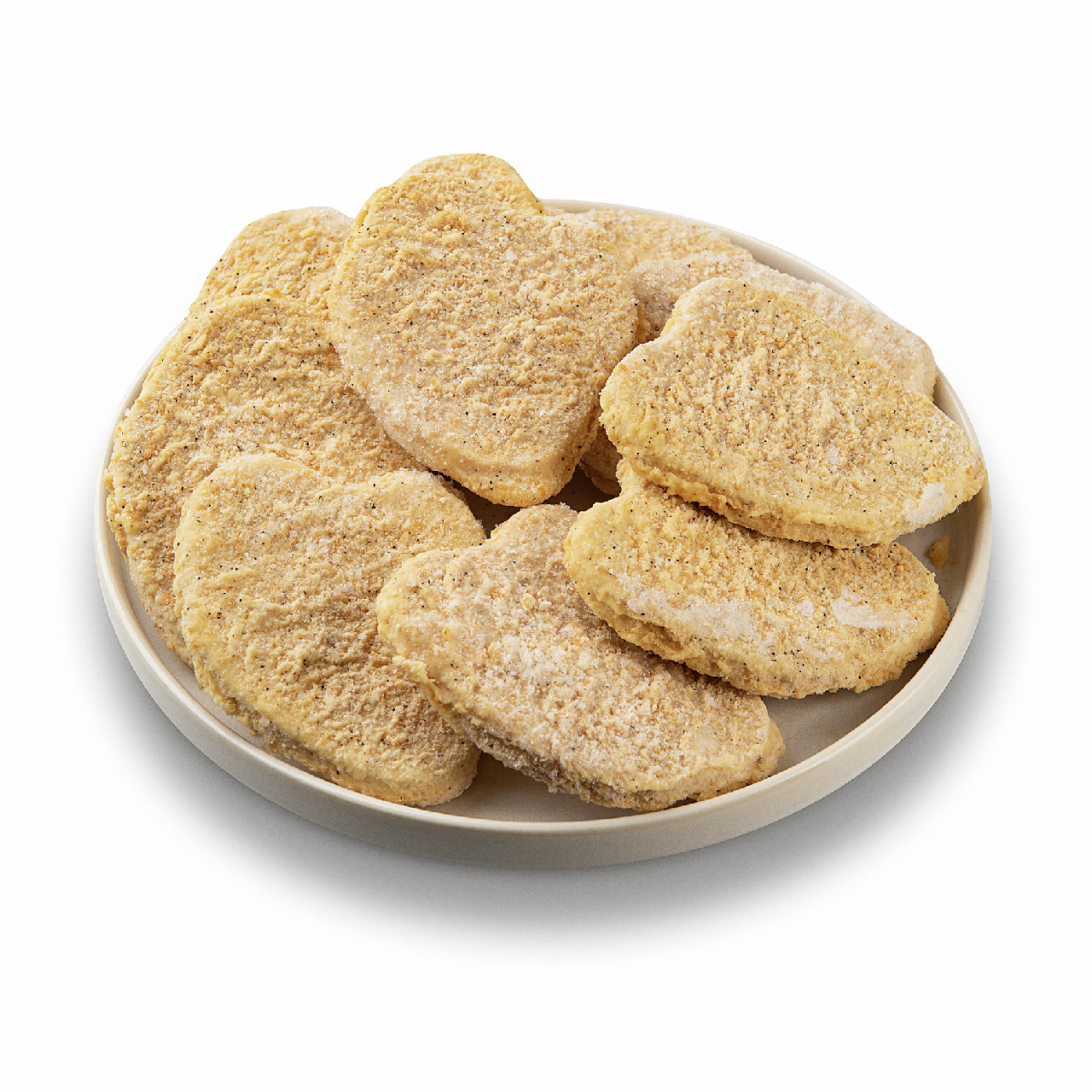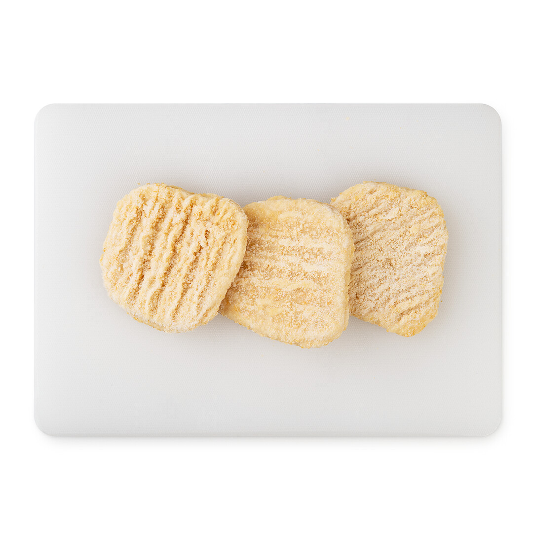 Филе цыплят-бройлеров, вода, пшеничная мука, соль, разрыхлители: Е450, E500, декстроза, подсолнечное масло, пшеничный глютен, кожа цыплят-бройлеров, манная крупа, пшеничная клейковина, картофельный крахмал.