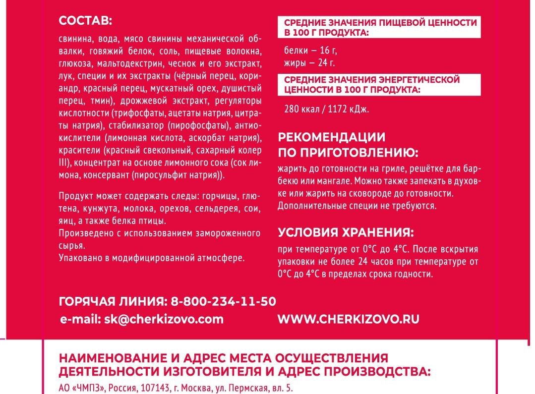 Свинина, вода, мясо свинины механической обвалки, говяжий белок, соль, пищевые волокна, глюкоза, мальтодекстрин, чеснок и его экстракт, лук, специи и их экстракты чёрный перец, кориандр, красный перец, мускатный орех, душистый перец, тмин, дрожжевой экстракт, регуляторы кислотности трифосфаты, ацетаты натрия, цитраты натрия, стабилизатор пирофосфаты, антиокислители лимонная кислота, аскорбат натрия, красители красный свекольный, сахарный колер III, концентрат на основе лимонного сока сок лимона, консервант пиросульфит натрия.