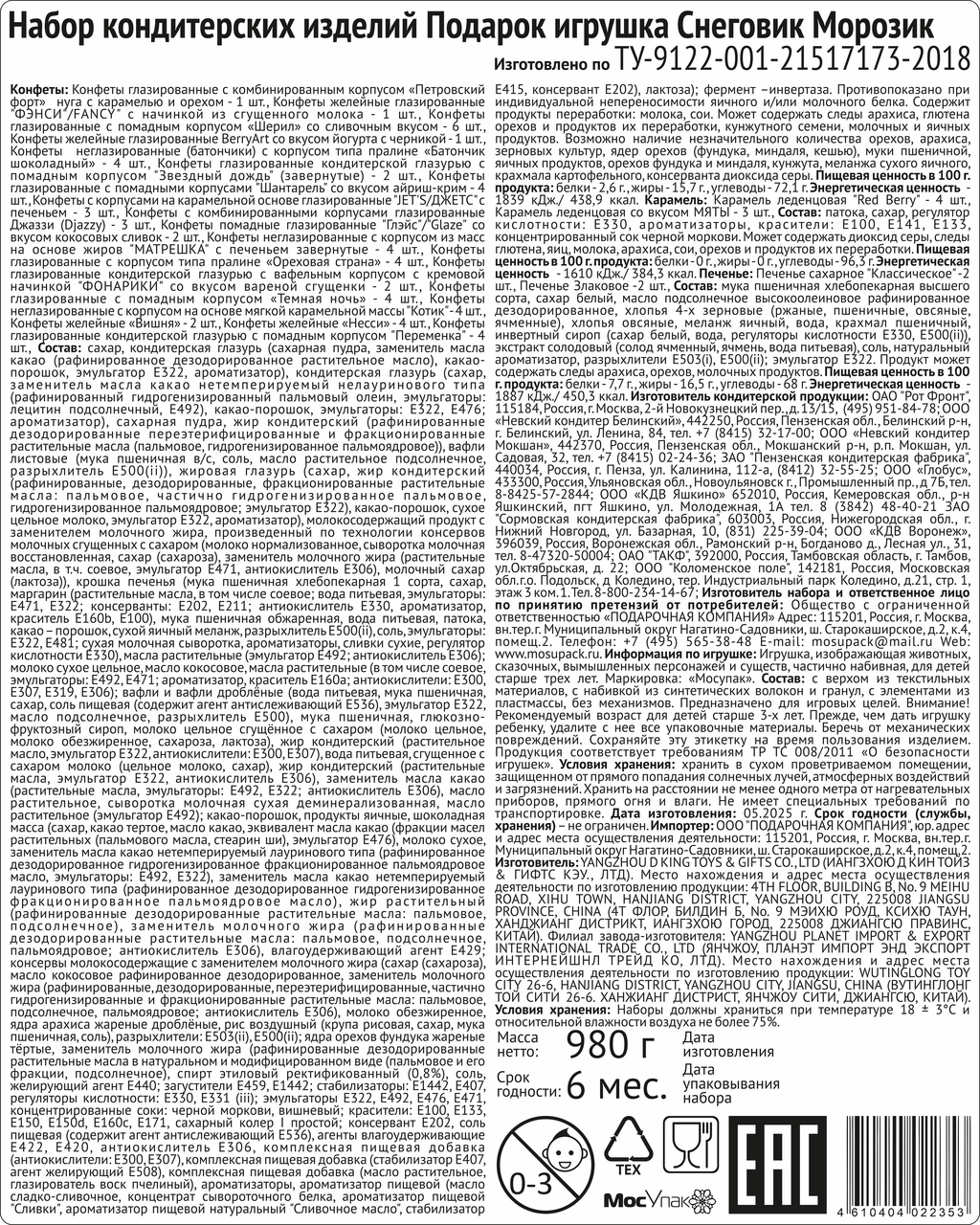 Сладкий набор, МосУпак, Подарок Снеговик Морозик - 980гр, содержит кондитерские изделия кондитерских фабрик Невский кондитер, Объединенные кондитеры, КДВ, Коломенское поле. Классическая детская игрушка. Снеговик является одной из самых популярных детских игрушек. На шее у снеговика модный шарфик, что создает праздничное настроение. К снеговикам неравнодушны как дети так и взрослые, все их лепили. Снеговик будет всегда актуален в качестве подарка. Кондитерские изделия упакованы в отдельный пластиковый пакет, который находится внутри игрушки. Игрушка выполнена из экологически чистых материалов.