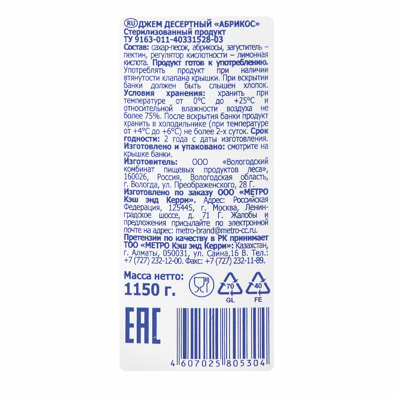 Джем абрикосовый METRO Chef, 1150 г – полезный и вкусный продукт, который обладает сбалансированным, приятным, кисло-сладким вкусом спелого абрикоса и густой консистенцией. Благодаря хорошей текстуре джем легко намазывается на хлеб, тосты, подойдет для промазывания коржей для тортов. Абрикосовый джем упакован в стеклянные баночки с завинчивающейся крышкой. Свежесть данного продукта определяется сроком годности, указанном на этикетке и характерным щелчком, который издает крышка при первом открывании.