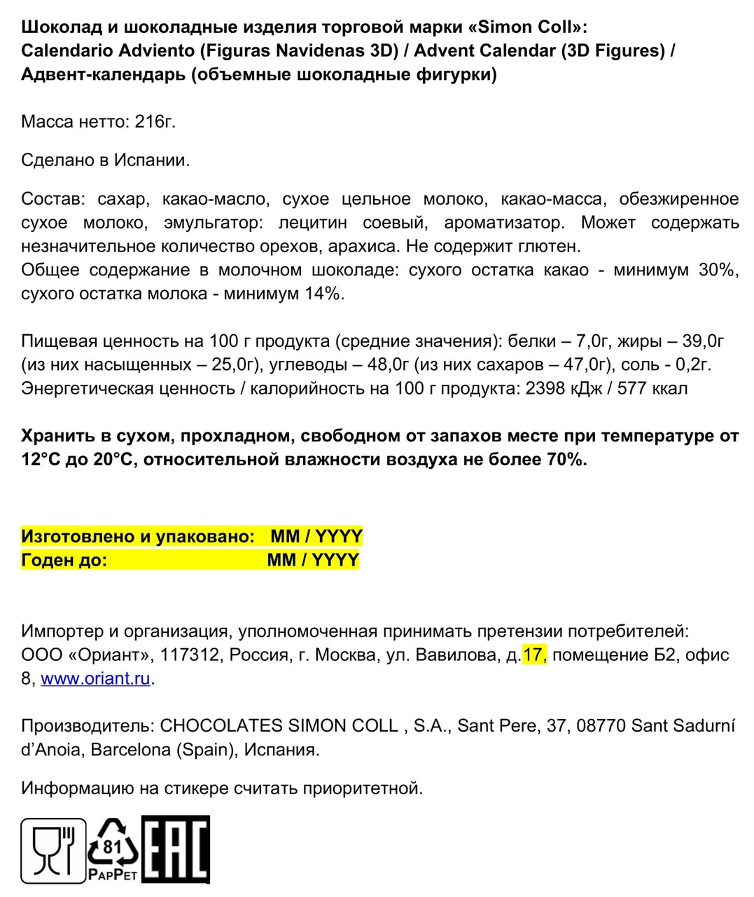 Шоколадная фабрика Simn Coll является одной из старейших фабрик, расположенных в самом центре Испании. Преданность делу мастеров-шоколатье, постоянно внедряющиеся инновации и уникальная рецептура являются синонимами производственного процесса.В преддверии новогодних и рождественских празников фабрика специально выпустила ряд тематической продукции, и, конечно, номером один и хитом продаж является адвент-календарь. Открывать окошки на протяжение всего декабря - известная многим рождественская традиция. А когда при этом получаешь милую шоколадную фигурку - особое удовольствие. В наборе 24 объемные фигурки новогодних персонажей, выполненные из вкуснейшего молочного шоколада премиум качества.Новогодний адвент-календарь от Simon Coll создаст поистине праздничное настроение, а предвкушение Нового Года будет сладким и веселым.Сделано в Испании.