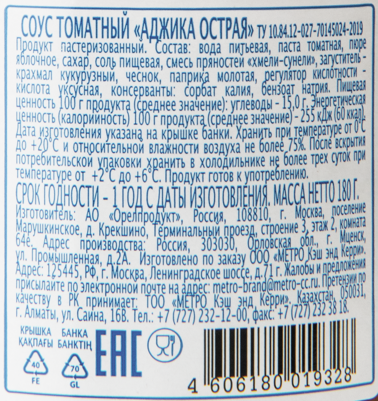 Вода питьевая, паста томатная, пюре яблочное, сахар-песок, соль поваренная пищевая, смесь пряностей хмели-сунели, загуститель – крахмал кукурузный, чеснок, паприка молотая, регулятор кислотности – кислота уксусная, консерванты: сорбат калия, бензоат натрия.