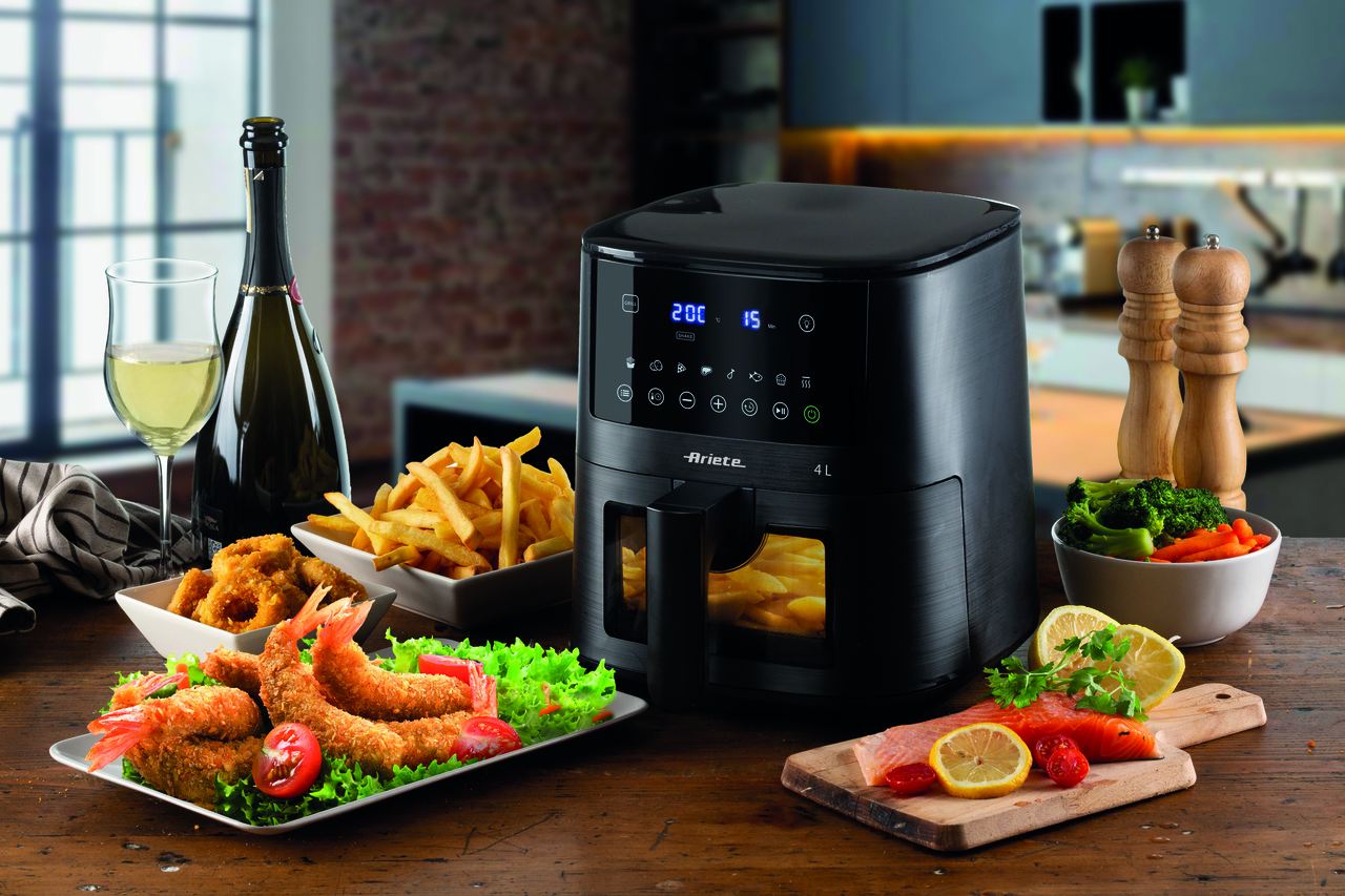 Жарка с использованием всего лишь ложки масла: при жарке на воздухе масло не используется (достаточно всего одной ложки!), но без ущерба для хрустящей корочки, характерной для жарки во фритюре. Жарка без запаха: высокотемпературный воздух циркулирует внутри фритюрницы и быстро готовит. и без жира, без дыма и запахов, выходящих наружу Многофункциональность: готовьте так, как нравится вам и вашей семье. Благодаря функции гриля и коктейля и 9 предустановленным программам вы можете установить таймер, время приготовления и температуру. Количество: до 1,5кг жареных блюд. На любой вкус: настраивайте температуру, программу и таймер индивидуально под готовящееся блюдо благодаря большой сенсорной панели управления.