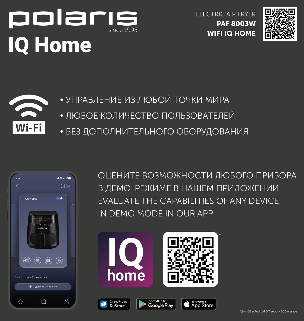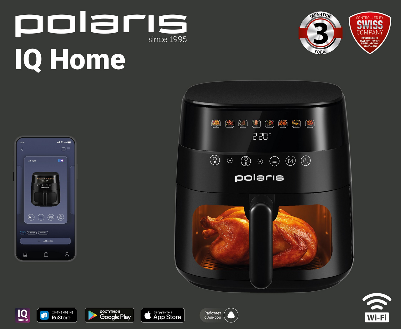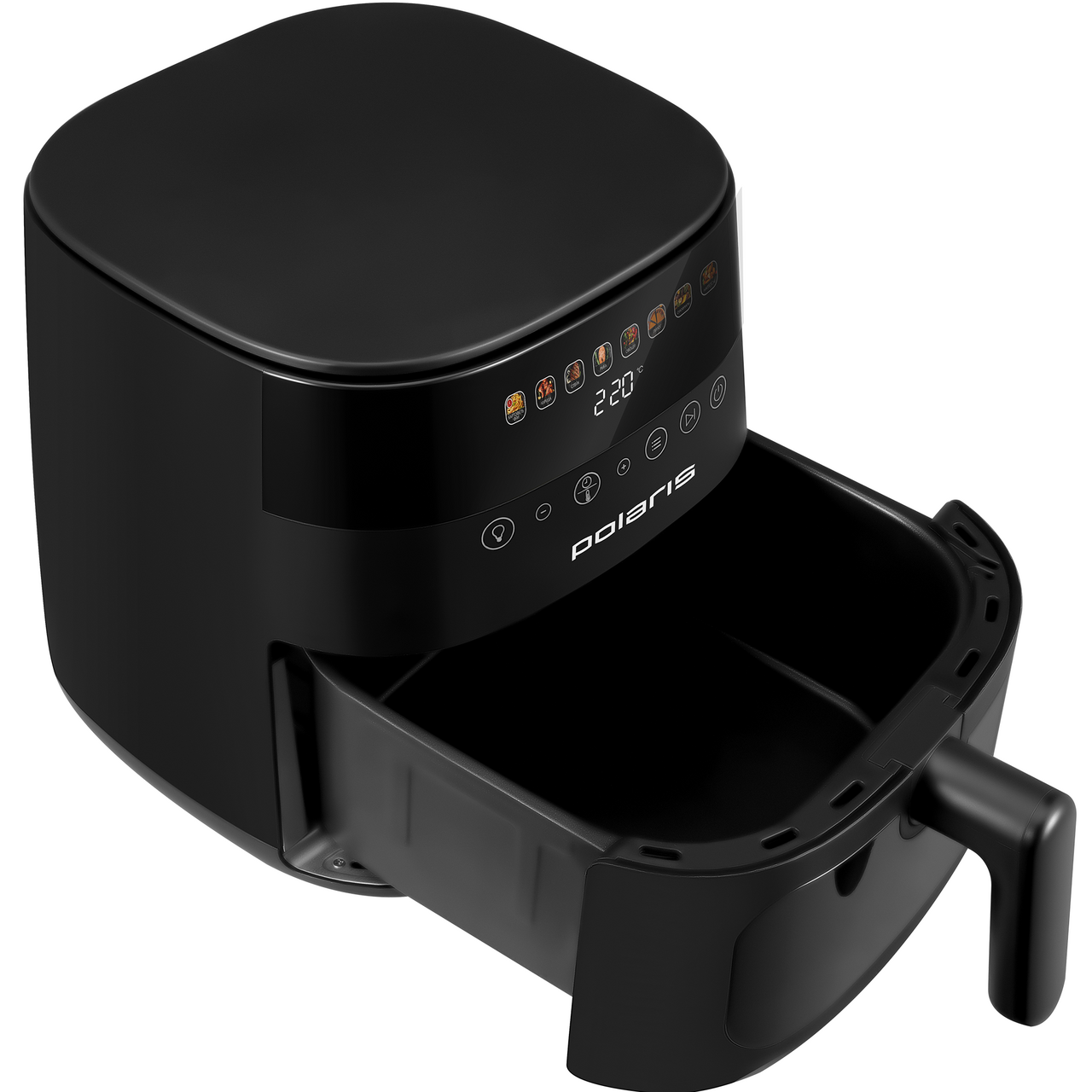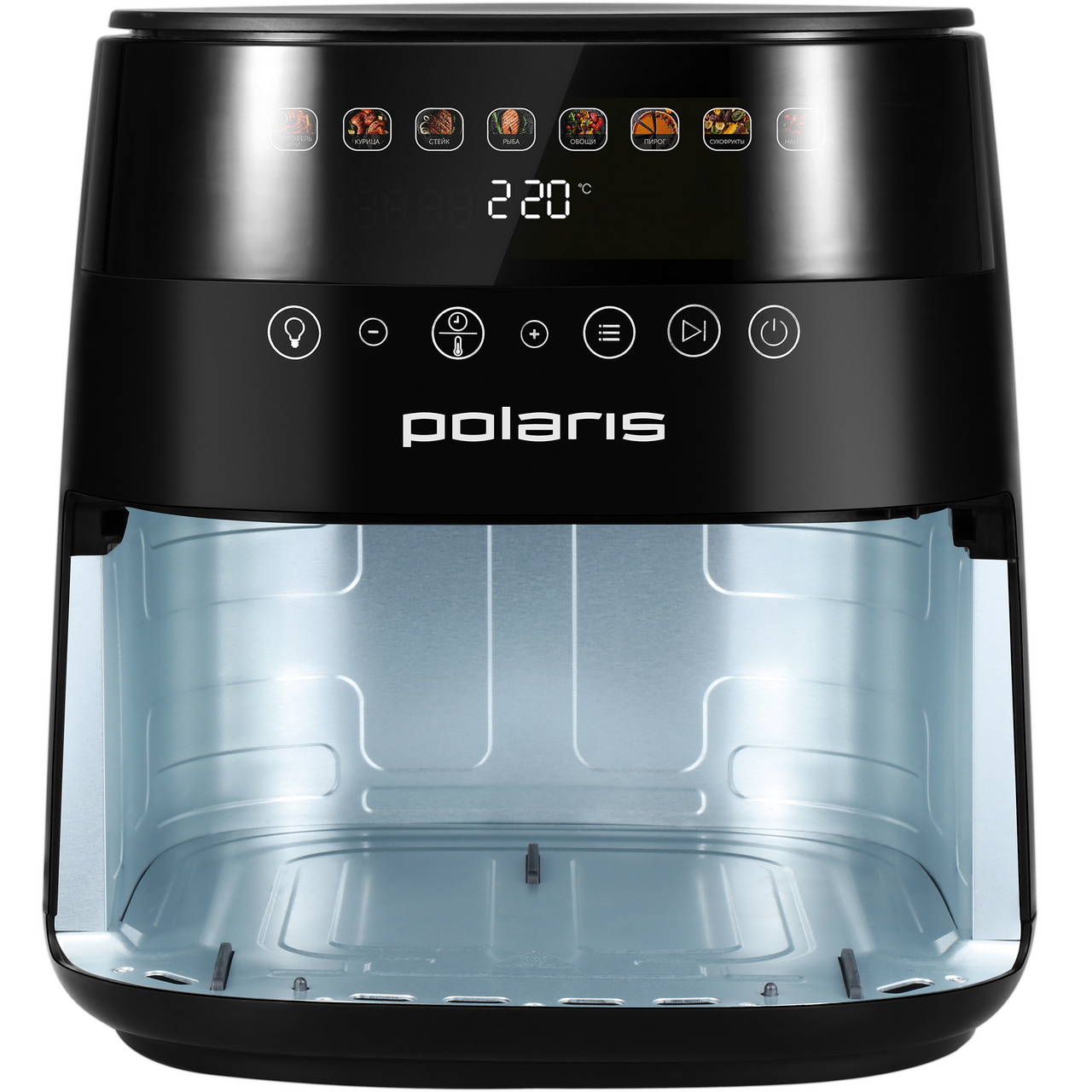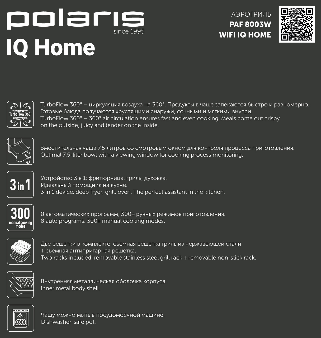 Аэрогриль 3 в 1: фритюрница, гриль и духовка в одном устройстве. Технология TurboFlow 360С обеспечивает циркуляцию горячего воздуха на 360С, благодаря чему блюда получаются хрустящими снаружи и сочными внутри.Вместительная чаша объёмом 7,5 литров со смотровым окном и прочным антипригарным покрытием безопасна для здоровья, устойчива к царапинам и подходит для мытья в посудомоечной машине. В комплект входят две решётки (нержавеющая и антипригарная), а также книга рецептов.Аэрогриль оснащён многофункциональным цветным сенсорным дисплеем, поддерживает 8 автоматических программ (картофель фри, курица, стейк, рыба, овощи, пирог, сухофрукты, наггетсы) и 300+ ручных режимов с возможностью установки пользовательских настроек времени и температуры.Мощность 1800Вт обеспечивает быстрый нагрев и стабильный результат, а внутренняя металлическая оболочка корпуса повышает долговечность прибора. Модель поддерживает приложение Polaris IQ Home, что позволяет управлять аэрогрилем со смартфона через удобное приложение.