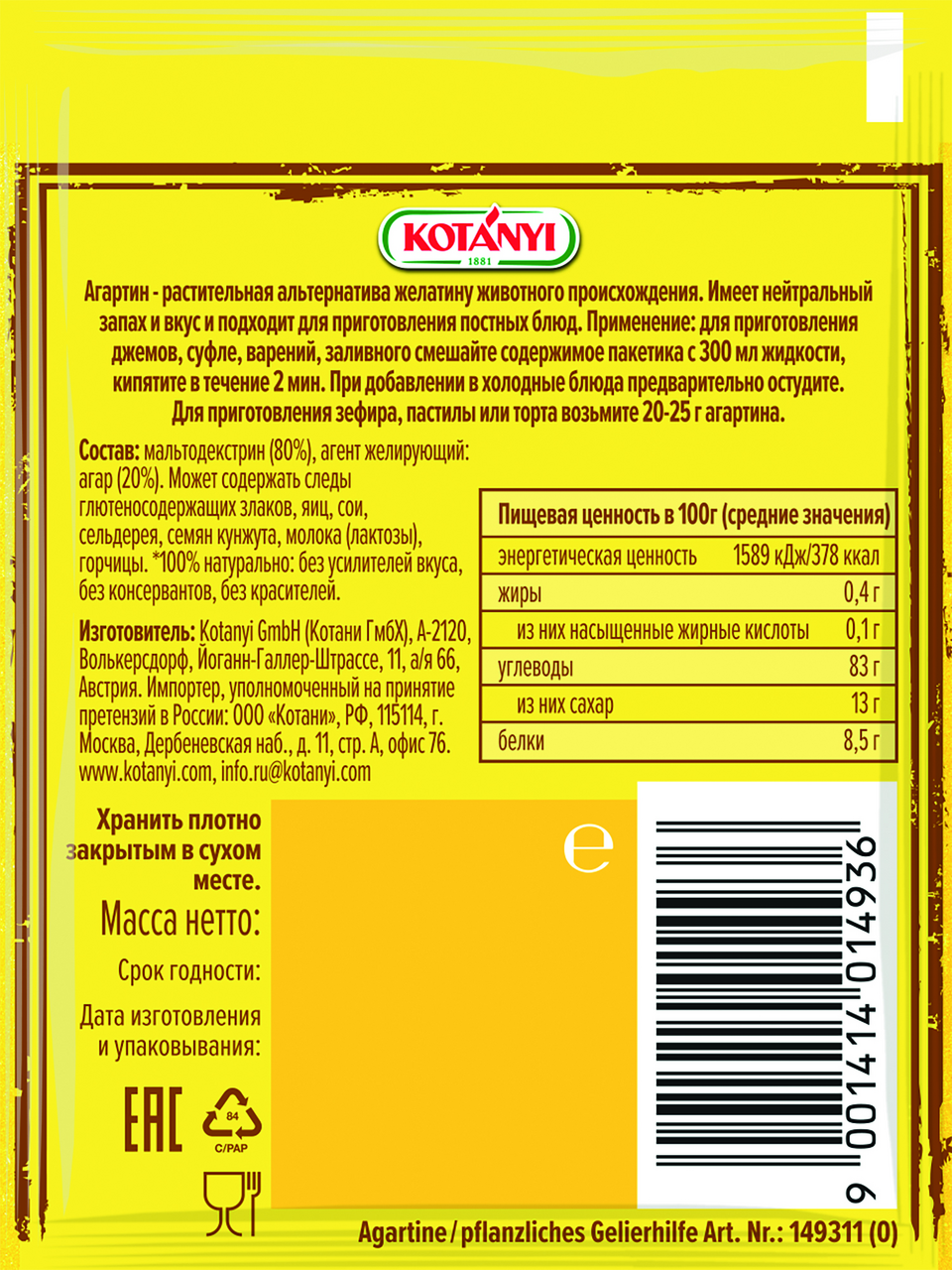 Агар-Агар Kotanyi в пачке 10 г – растительная альтернатива традиционному желатину. Изготавливается из морских водорослей, богатых минеральными элементами и витаминами, необходимыми для молодости и здоровья организма человека. Это низкокалорийный продукт, который можно использовать для приготовления различных легких десертов и постных блюд. Обладает нейтральным вкусом и запахом.