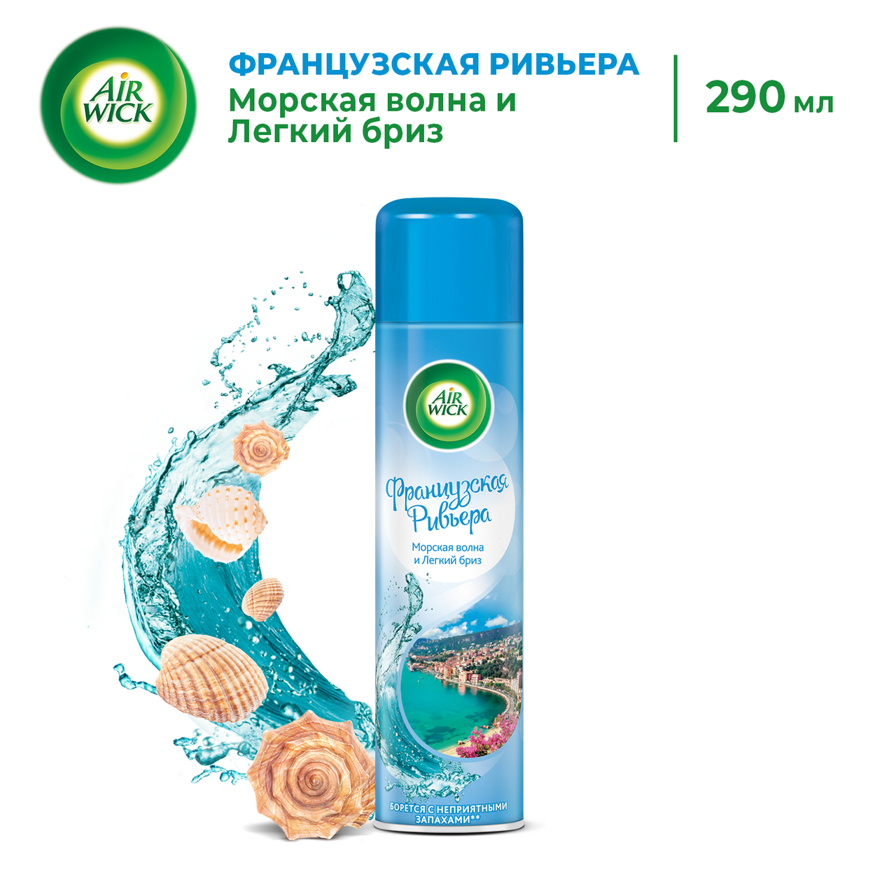 Аэрозоль-освежитель воздуха Air Wick Французская Ривьера* из новой коллекции Ароматы мира** эффективно борется с неприятными запахами***, оставляя ощущение свежести морских волн и легкий бриз Французской Ривьеры. *Французская Ривьера не является местом производства товара. Место производства / адрес изготовителя товара см. на упаковке. **На рынке с августа 2019. ***На основании отчета Рекитт Бенкизер от 12.10.2018 (г. Халл, Великобритания).