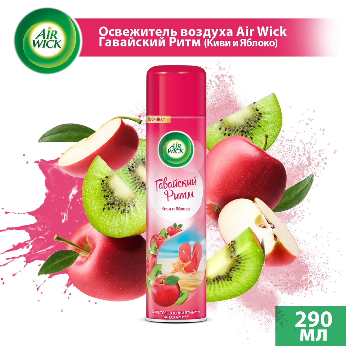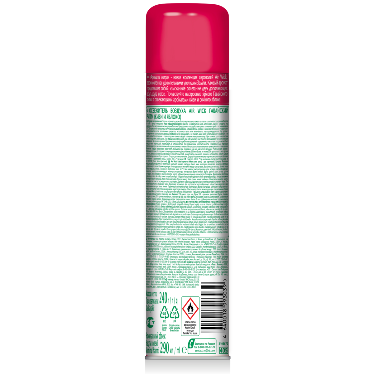 Аэрозоль-освежитель воздуха Air Wick Гавайский ритм из новой коллекции Ароматы мира* эффективно борется с неприятными запахами**, создавая настроение яркого Гавайского ритма с освежающими ароматами киви и сочного яблока. *На рынке с августа 2019. **На основании отчета Рекитт Бенкизер от 12.10.2018 (г. Халл, Великобритания).