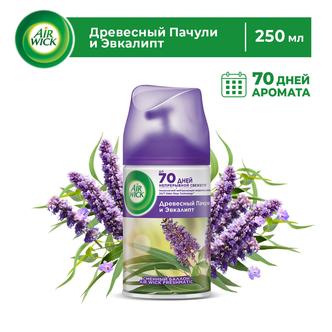 Наполните дом чарующим сочетанием ароматов пачули и эвкалипта с Air Wick Pure Древесный Пачули и Эвкалипт. Содержит эфирные масла****. Вставьте сменный баллон в элегантное устройство, выберите интенсивность распыления, и Air Wick Freshmatic будет бороться с неприятными запахами* автоматически день за днем. Преимущества автоматического освежителя Air Wick Freshmatic: - До 60 дней свежести**; - 1 спрей освежает целую комнату***; - Содержит эфирные масла****; - Рекомендуется использовать с автоматическим аэрозольным освежителем Air Wick Freshmatic. *На основании отчета исследовательского центра Рекитт Бенкизер (Халл, Великобритания) от 23 августа 2018 года в отношении запахов в туалете, на кухне, а также животных. **Эффективен до 60 дней при низком уровне интенсивности аромата и нормальных условиях окружающей среды. ***1 спрей освежает помещение объемом 28 м3 согласно данным исследовательского центра Рекитт Бенкизер, отчет №зк-14-04-02 от 27.03.2014 г.