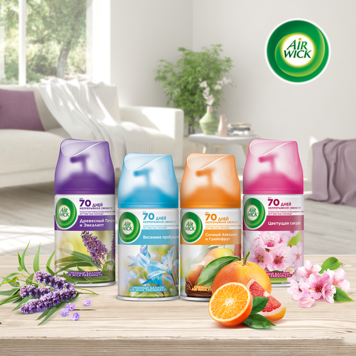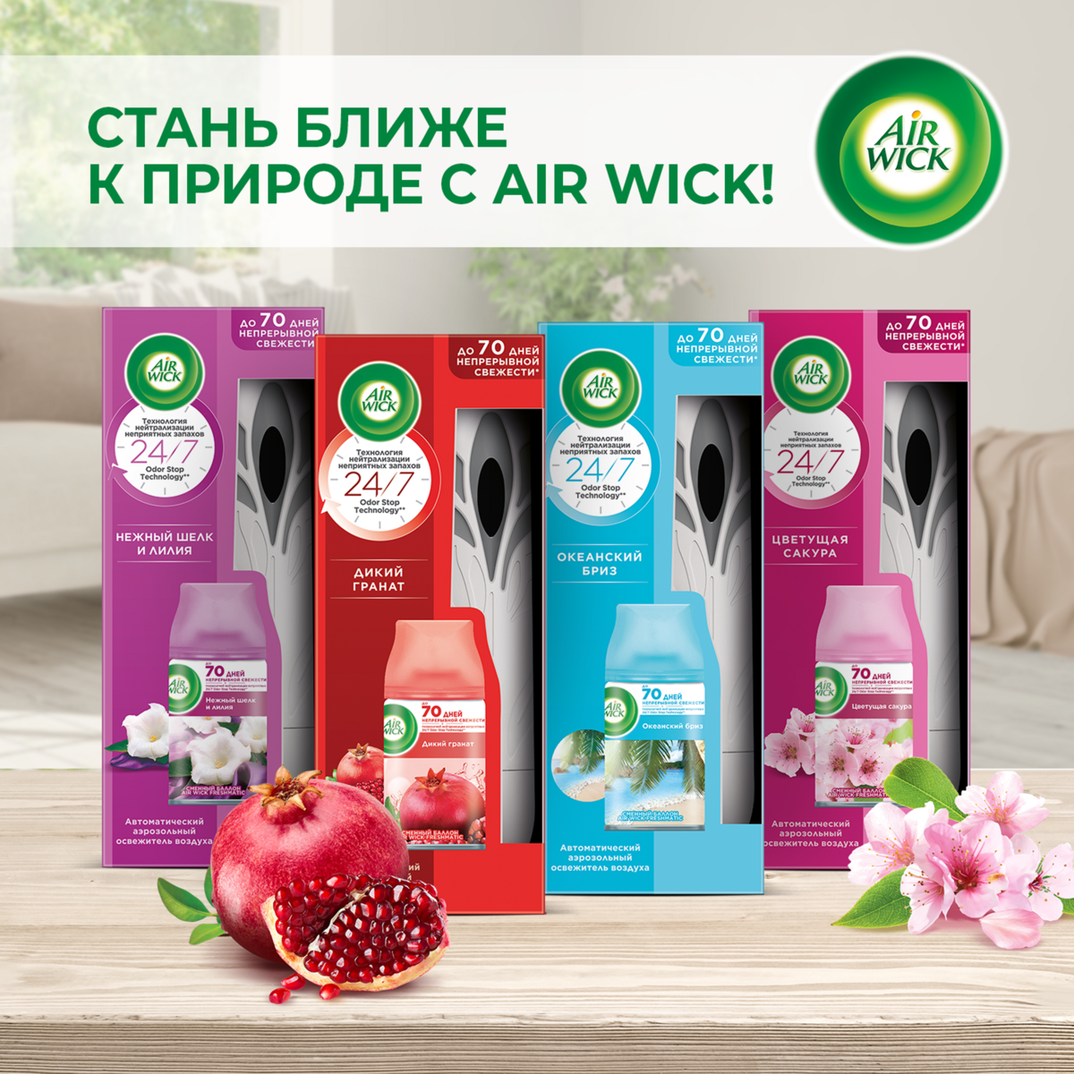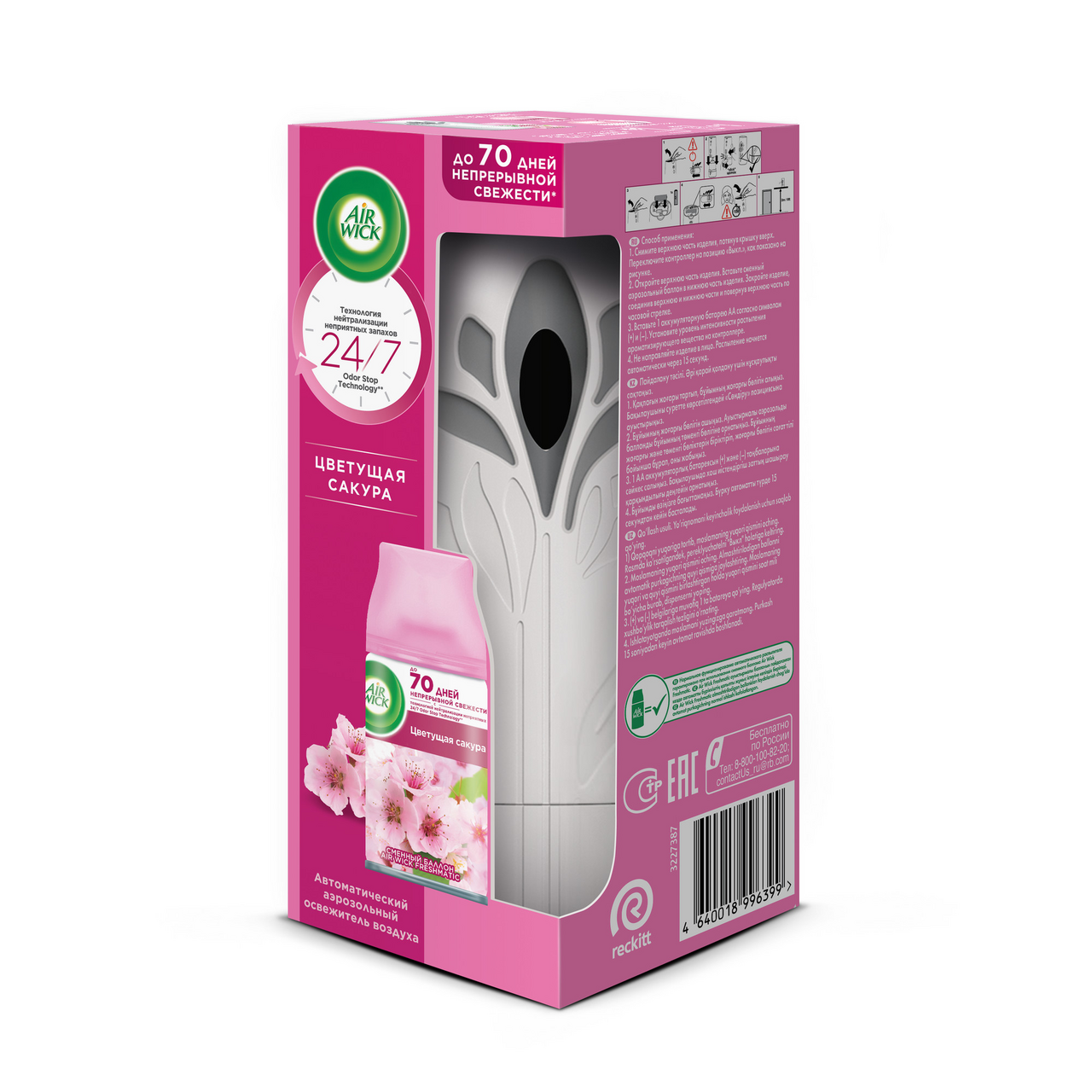 Наслаждайтесь утонченным ароматом цветущей сакуры в течение 70 дней вместе с автоматическим аэрозольным освежителем Air Wick Freshmatic. * Комплект из автоматического распылителя и сменного баллона освежителя воздуха поможет поддерживать в доме приятный и свежий аромат. Средство прекрасно борется с любыми нежелательными запахами. Его можно устанавливать на кухне, в ванной комнате или туалете. Аэрозоль не оставляет разводов и других следов на занавесках, мебели и других предметах. *При использовании на минимальных настройках распыления, согласно отчету ASC-236 от 06.12.2019г. АрЭндДи Рекитт Бенкизер, г.Халл, Великобритания.