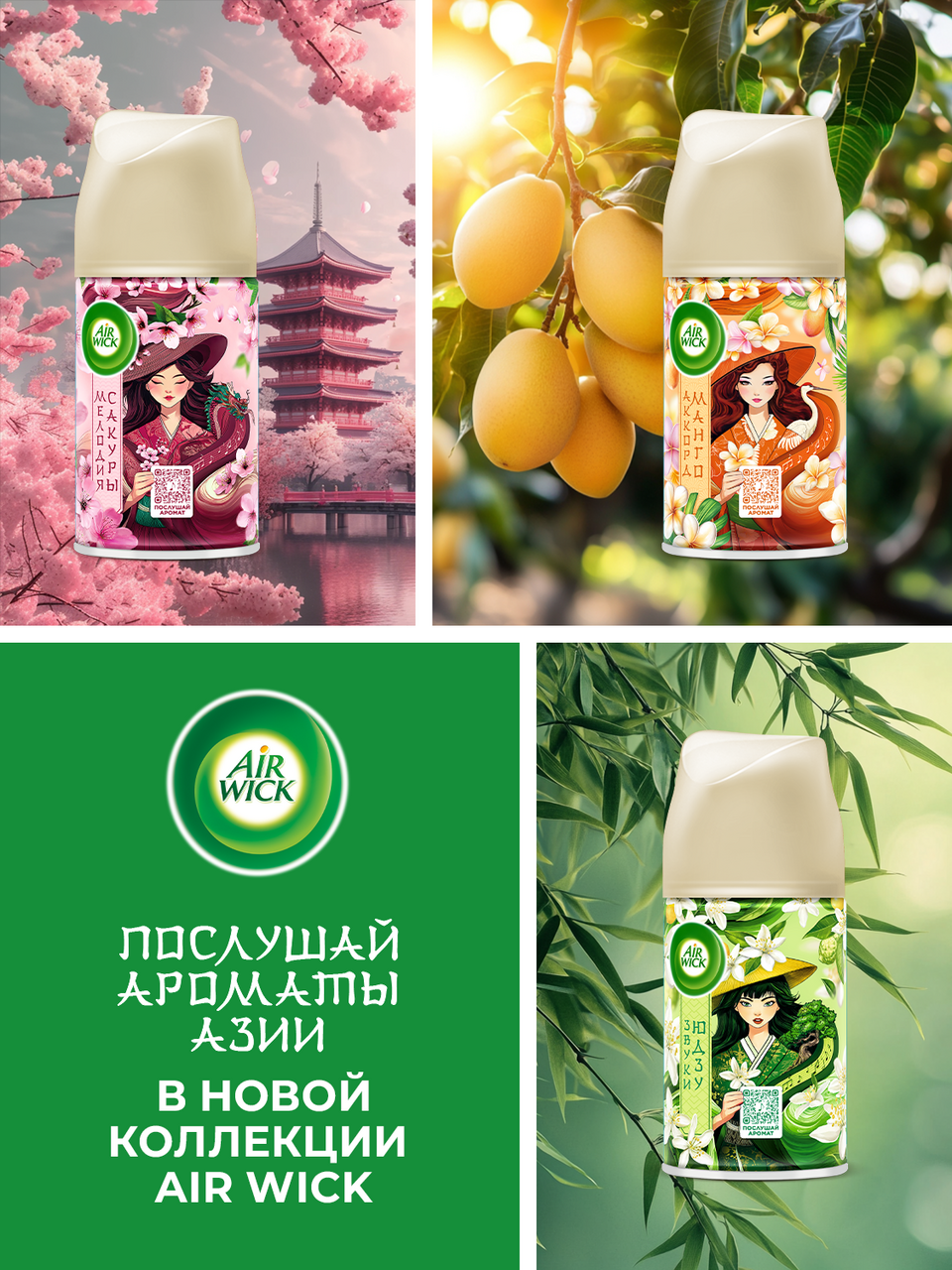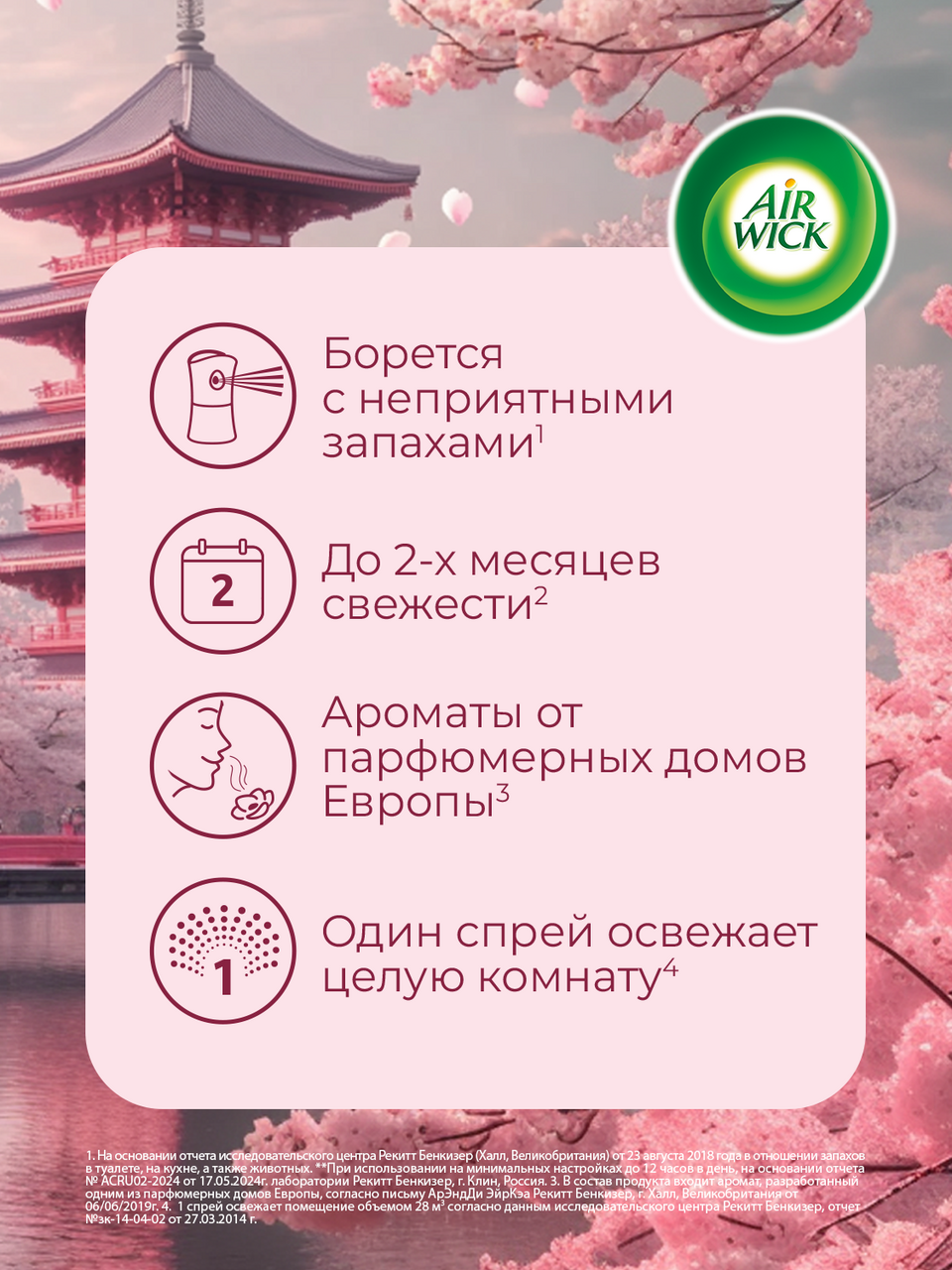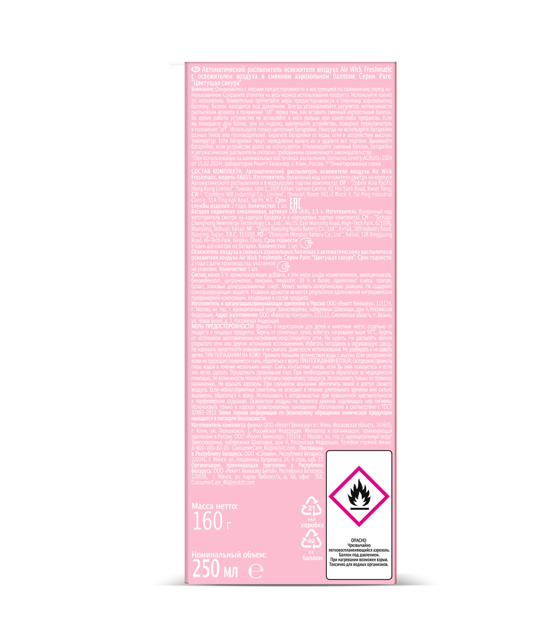 Наслаждайтесь утонченным ароматом цветущей сакуры в течение 70 дней вместе с автоматическим аэрозольным освежителем Air Wick Freshmatic. * Комплект из автоматического распылителя и сменного баллона освежителя воздуха поможет поддерживать в доме приятный и свежий аромат. Средство прекрасно борется с любыми нежелательными запахами. Его можно устанавливать на кухне, в ванной комнате или туалете. Аэрозоль не оставляет разводов и других следов на занавесках, мебели и других предметах. *При использовании на минимальных настройках распыления, согласно отчету ASC-236 от 06.12.2019г. АрЭндДи Рекитт Бенкизер, г.Халл, Великобритания.