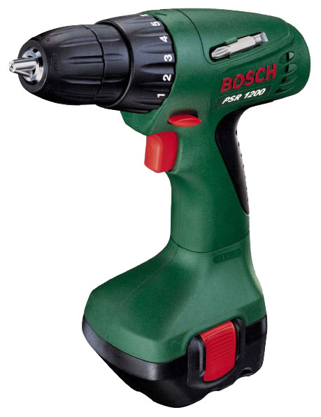 Аккумуляторный шуруповерт BOSCH PSR 1200мощность 12Вт, быстрозажимной патрон, 1 скорость, диаметр патрона 10 мм, макс. число оборотов холостого хода 700 обмин, макс. диаметр сверления (дерево металл бетон) 20 мм 10 мм, отсек для хранения бит в корпусе.