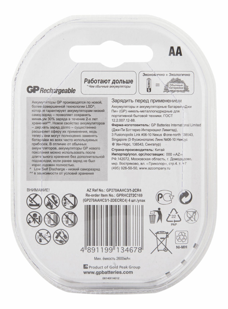 Комплект никель-металлогидридных аккумуляторов от GP – идеальное решение для энергоемких и часто используемых устройств: цифровых фотоаппаратов, фотовспышек, фонарей, часов, игровых мини-приставок и детских игрушек, будильников, MP3-плееров, компьютерных мышек и клавиатур, медицинских приборов и т. д. Аккумуляторы имеют большой объем емкости – 2700 мАч. В результате они имеют увеличенную продолжительность работы. Элементы питания GP выдерживают до 500 циклов перезарядки. Никель-металлогидридные аккумуляторы практически не имеют эффекта памяти: их не нужно полностью разряжать перед зарядкой, чтобы они соответствовали своей номинальной емкости. Приобретение комплекта из четырех элементов питания 270AAHC3/1-CR4 еще и дает дополнительную экономию: по факту вы платите всего за три аккумулятора, а четвертый получаете в подарок.