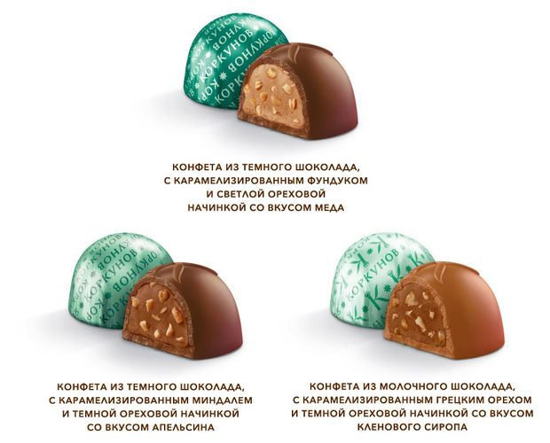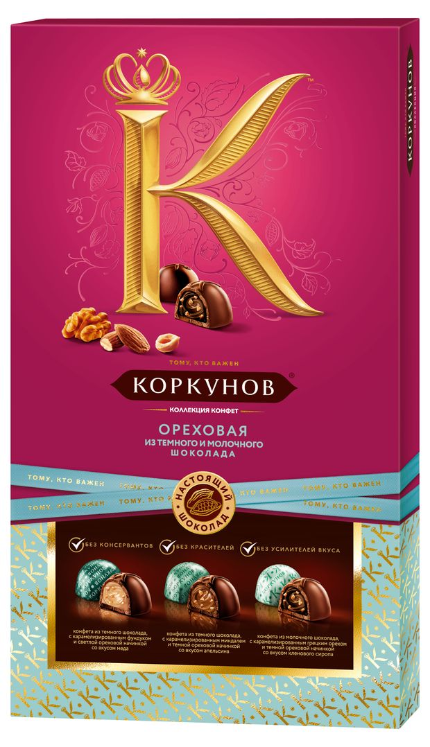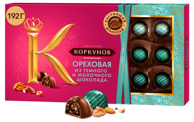Коллекция шоколадных конфет Коркунов — изысканный и необычайно вкусный комплимент для Ваших коллег и партнеров, а также утонченный подарок для тех, кто Вам особенно важен. Удивительная и гармоничная композиция, составленная из разнообразных сочетаний настоящего шоколада, карамелизированного грецкого ореха, миндаля и фундука, а также темной ореховой начинки со вкусом кленового сиропа и апельсина.