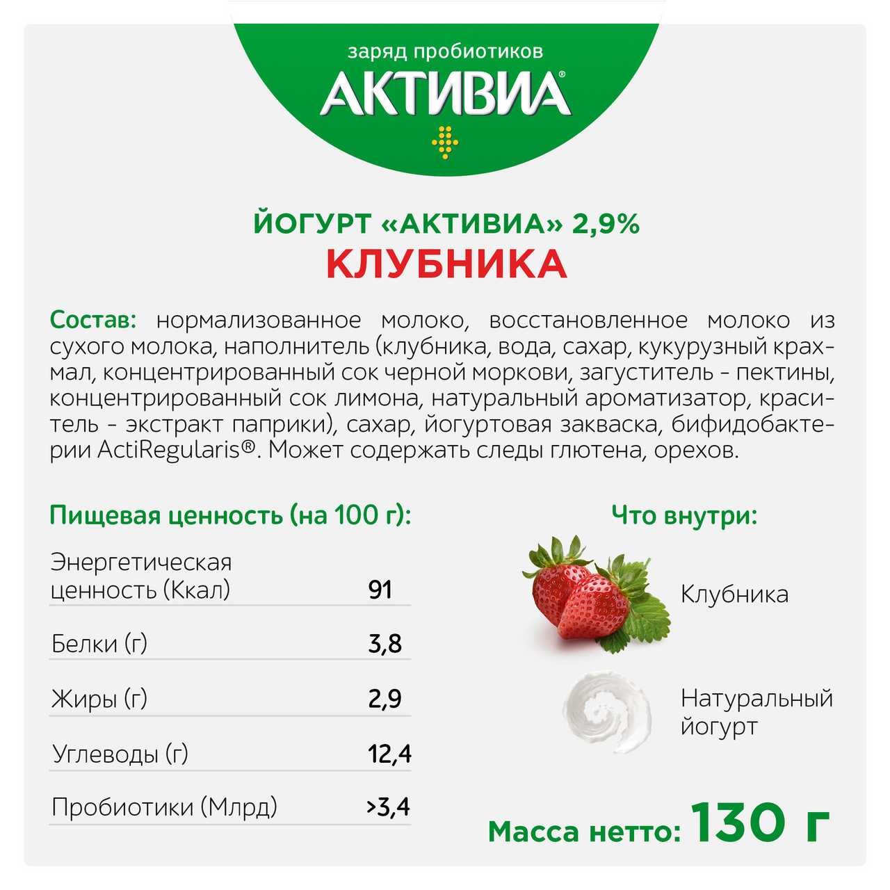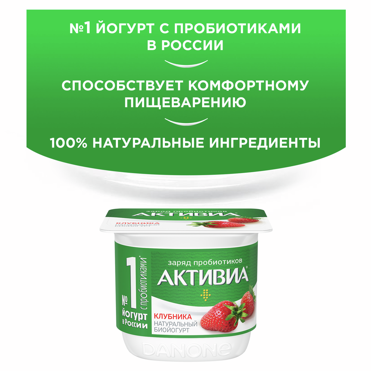 Биойогурт Активиа с клубникой содержит пробиотик. Этот йогурт — не только вкусный, но и полезный: он обогащен бактериями, способствующими комфортному пищеварению. Молочные продукты марки Активиа — результат двадцатилетней работы исследователей и экспертов