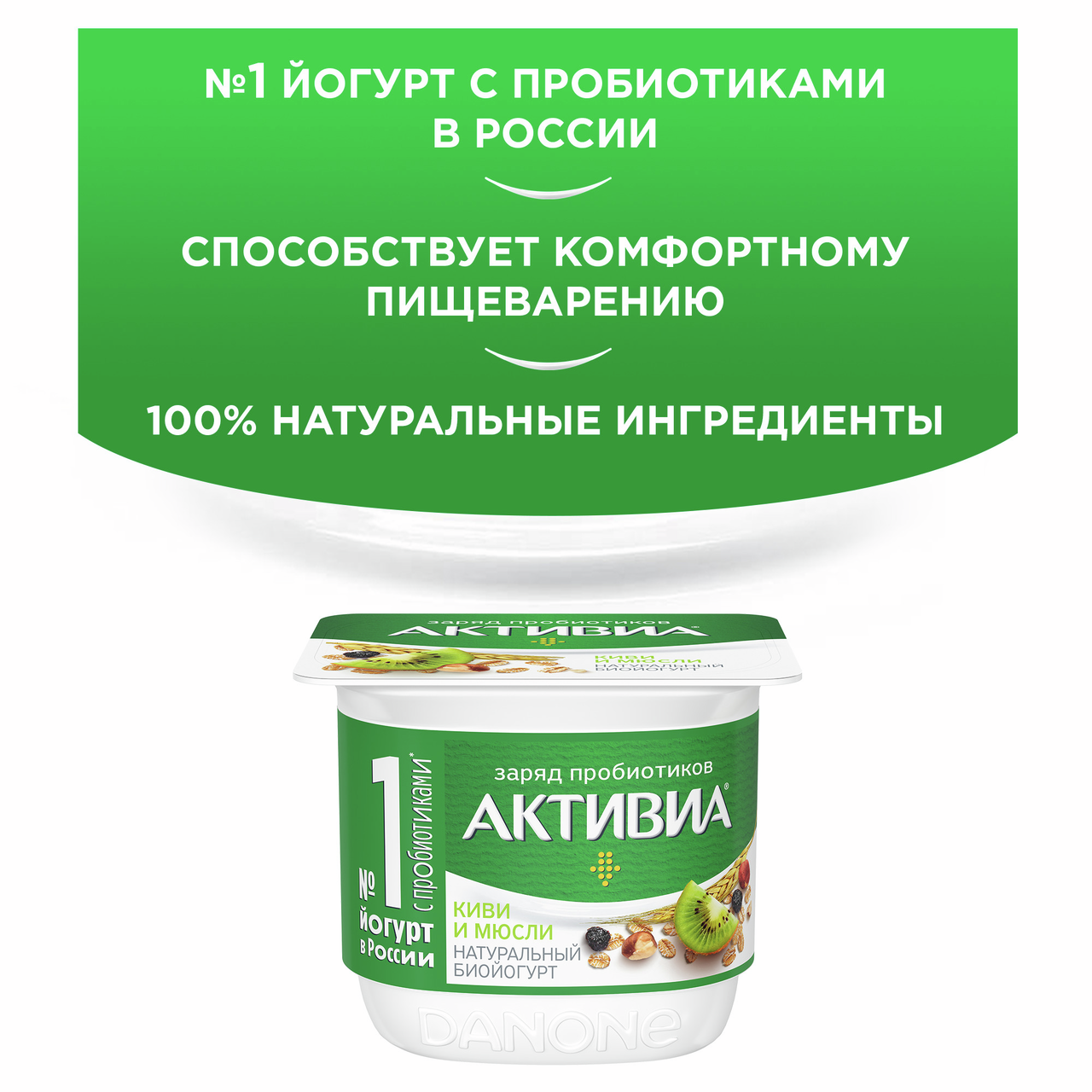 Биойогурт Активиа содержит пробиотик и способствует комфортному пищеварению! Этот йогурт — вкусный и сытный. В составе — киви, изюм, ржаные отруби, мед, овес, пшеница, ячмень и фундук. Вся польза злаков и орехов в сочетании с кисло-сладким вкусом киви! Молочные продукты марки Активиа — результат двадцатилетней работы исследователей и экспертов.