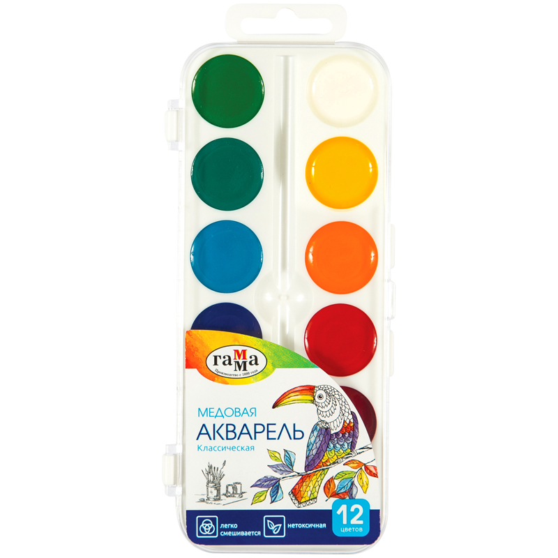 Акварель Гамма Классика без кисточки 12 цветов предназначена для творчества взрослых и детей. Набор можно приготовить для урока рисования в школе или детском саду, использовать для оформления плакатов и стенгазет в институте, купить для собственного увлечения изобразительным искусством. Современные акварельные краски представляют собой смесь безопасных для здоровья, экологически чистых компонентов, в основе кот��рых растительные клеи и пластификаторы. Они легко разводятся с водой, наносятся на бумагу тончайшим, практически прозрачным, но при этом цветным слоем, хорошо смешиваются между собой, не расплываются и быстро сохнут. После высыхания длительное время сохраняют первоначальную яркость. Набор упакован в стильный пенал с бесцветной откидной крышкой, которая в случае необходимости может служить палитрой. Прототип акварельных красок впервые был упомянут в летописях, относящихся ко 2 веку нашей эры.