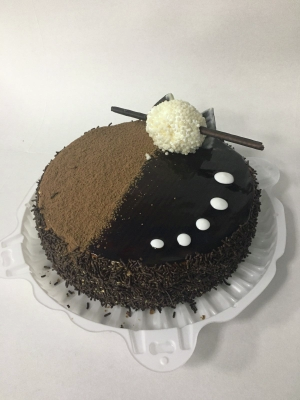 Классический бисквит, сироп, коньяк, безе, грецкие орехи, сливочный крем, вареное сгущенное молоко, какао, шоколадный гель.