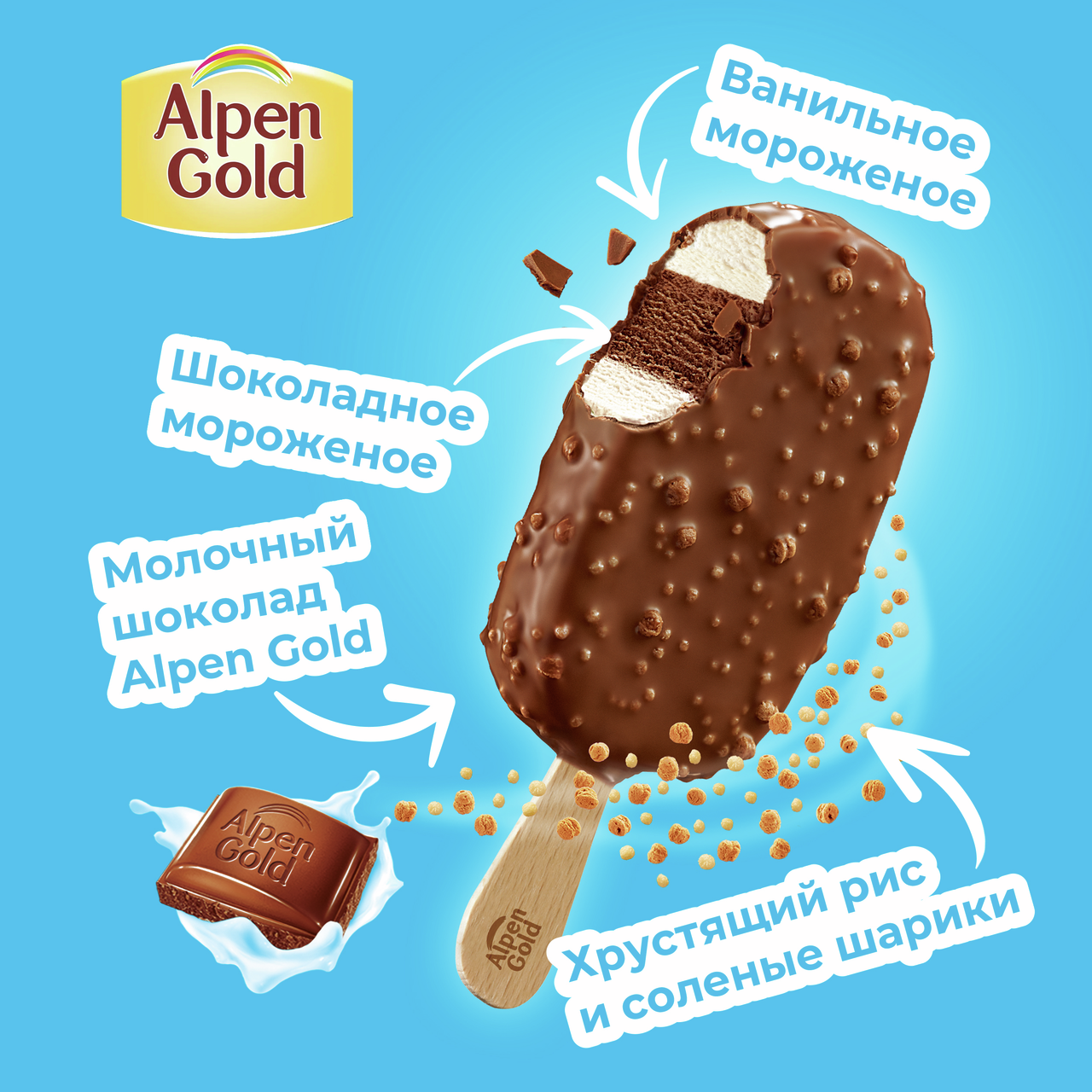 Любимый вкус теперь в мороженом! Мороженое со вкусом ванили и шоколада, покрытое настоящим шоколадом Alpen Gold с хрустящими рисовыми шариками.
