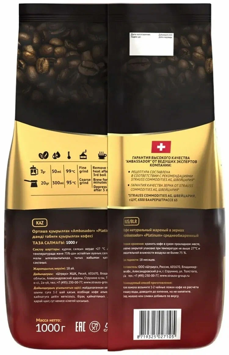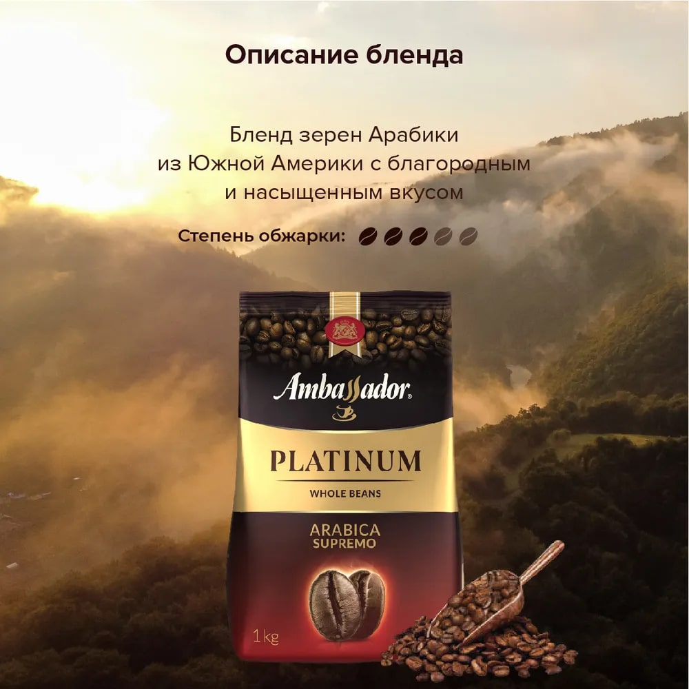 Кофе в зернах Ambassador Platinum порадует истинных ценителей этого напитка. Сорта кофе, составляющие купаж бленда, гармонично дополняют и подчеркивают достоинства друг друга. Ambassador Platinum – это фантастический богатый аромат с легкими нотками шоколада и мягкий, но насыщенный вкус. Приятная кислинка является признаком хорошего сорта арабики и грамотной обработки зерна. Такой кофе будет одинаково хорош и с добавлением молока или сливок, и в чистом ��иде.