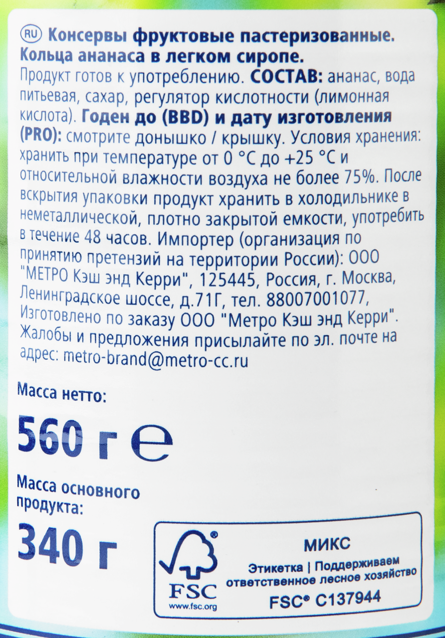 METRO Chef Ананасы кольца в сиропе, 560г