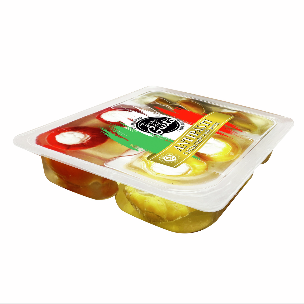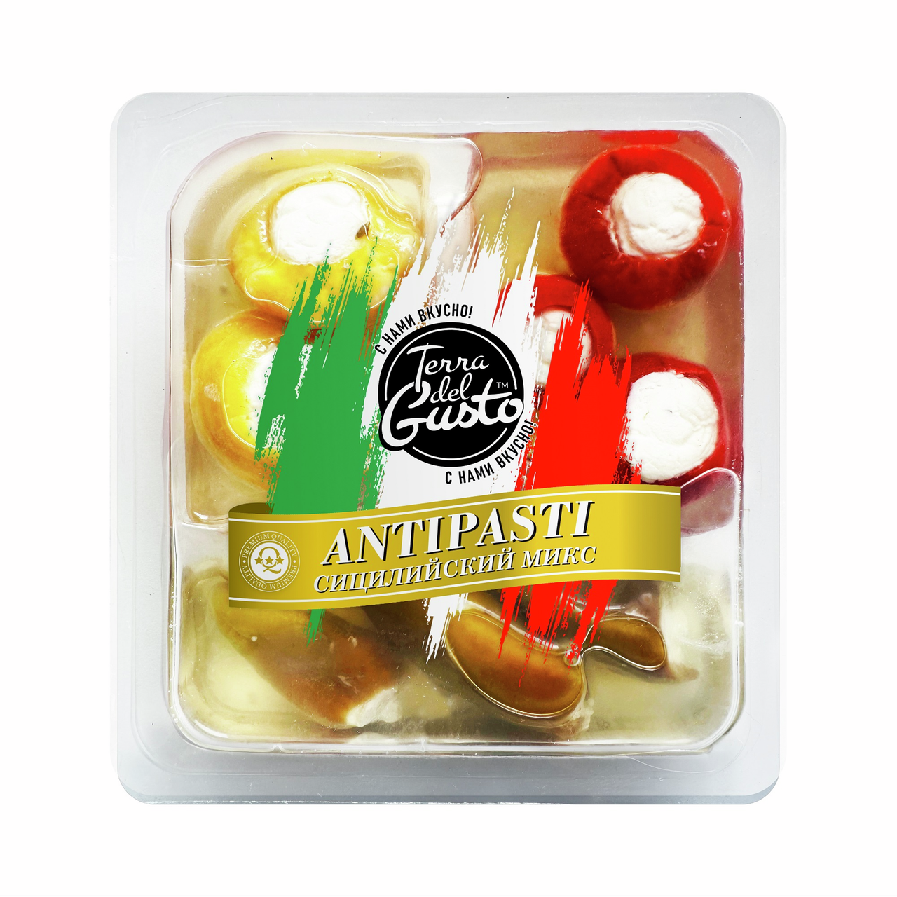 Антипасти Terra del Gusto Сицилийский микс, 190г - это традиционная холодная или горячая итальянская закуска. Закуски приготовлены по уникальным рецептам, в качестве начинки используется нежнейший сыр собственного производства, а процесс фаршировки происходит вручную.