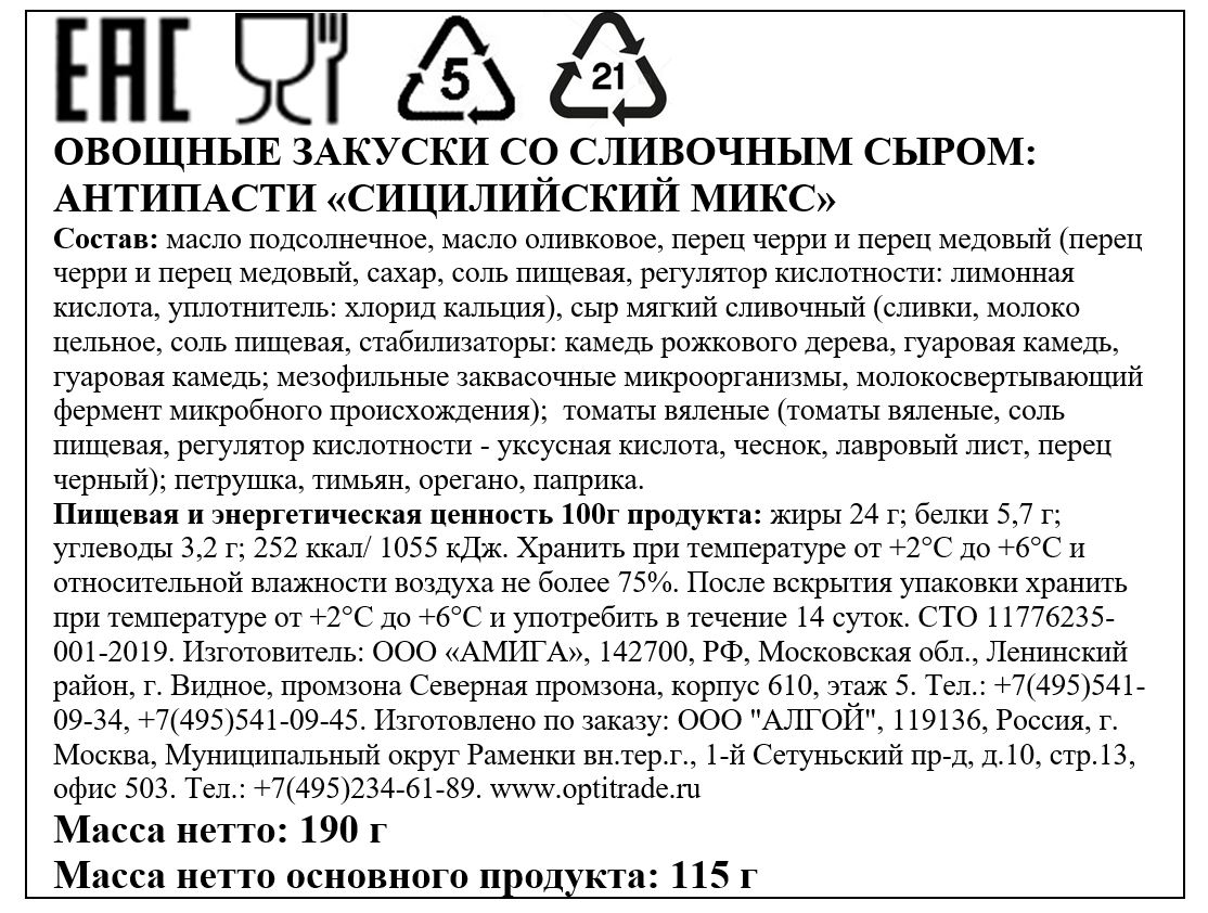 Масло подсолнечное, масло оливковое, перец черри и перец медовый (перец черри и перец медовый, сахар, соль пищевая, регулятор кислотности: лимонная кислота, уплотнитель: хлорид кальция), сыр мягкий сливочный (сливки, молоко цельное, соль пищевая, стабилизаторы: камедь рожкового дерева, гуаровая камедь, гуаровая камедь; мезофильные заквасочные микроорганизмы, молокосвертывающий фермент микробного происхождения); томаты вяленые (томаты вяленые, соль пищевая, регулятор кислотности - уксусная кислота, чеснок, лавровый лист, перец черный); петрушка, тимьян, орегано, паприка.