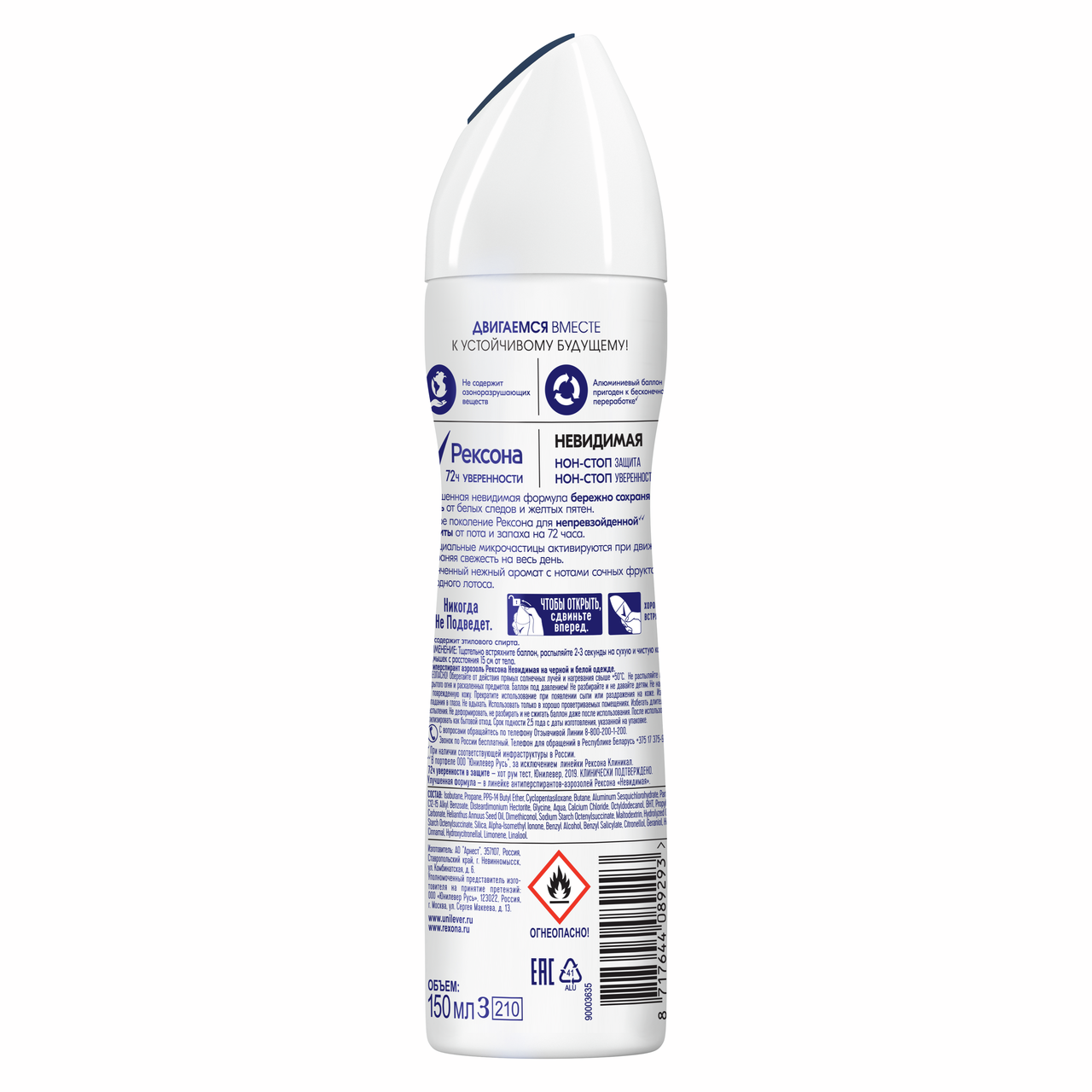 Активные ингредиенты дезодорант - антиперспирантов могут смешиваться с компонентами пота и жировыми выделениями, тем самым еще больше способствуя появлению стойких пятен на одежде в области подмышек. Забудь о них с дезодорант - антиперспирантом спреем Рексона Невидимая на черной и белой одежде. Формула этого дезодорант - антиперспиранта помогает свести к минимуму появление белых следов на черной одежде и желтых ? на белой. Этот женский дезодорант - антиперспирант бескомпромиссно защищает от пота и запаха в течение 48 часов. Он создан с использованием инновационной технологии Motionsense. Микрокапсулы, которые находятся на поверхности тела, раскрываются во время движения, высвобождая легкий утонченный аромат ландыша и жасмина с сочным арбузно-дынным акцентом и свежими травяными нотками. Прогулочный шаг, неспешная пробежка, спринтерский бег ? Тебе все по плечу, ведь мы позаботились о твоей защите. Чем бы ты ни занималась, ты будешь чувствовать только уверенность и комфорт. Ты создана для движения. Теперь у тебя есть антиперспирант, который сможет подстроиться под ритм твоей жизни. Покоряете ли вы новую вершину, спешите ли на автобус, выступаете ли с докладом или идете на свидание, будьте уверены, вы надежно защищены от пота и запаха - что бы вы ни запланировали, у Рексона есть решение! Наши продукты работают так же эффективно, как и вы. Мы стремимся узнать о поте как можно больше, чтобы затем использовать полученные знания для создания инновационных формул наших продуктов. Рексона никогда не подведет!