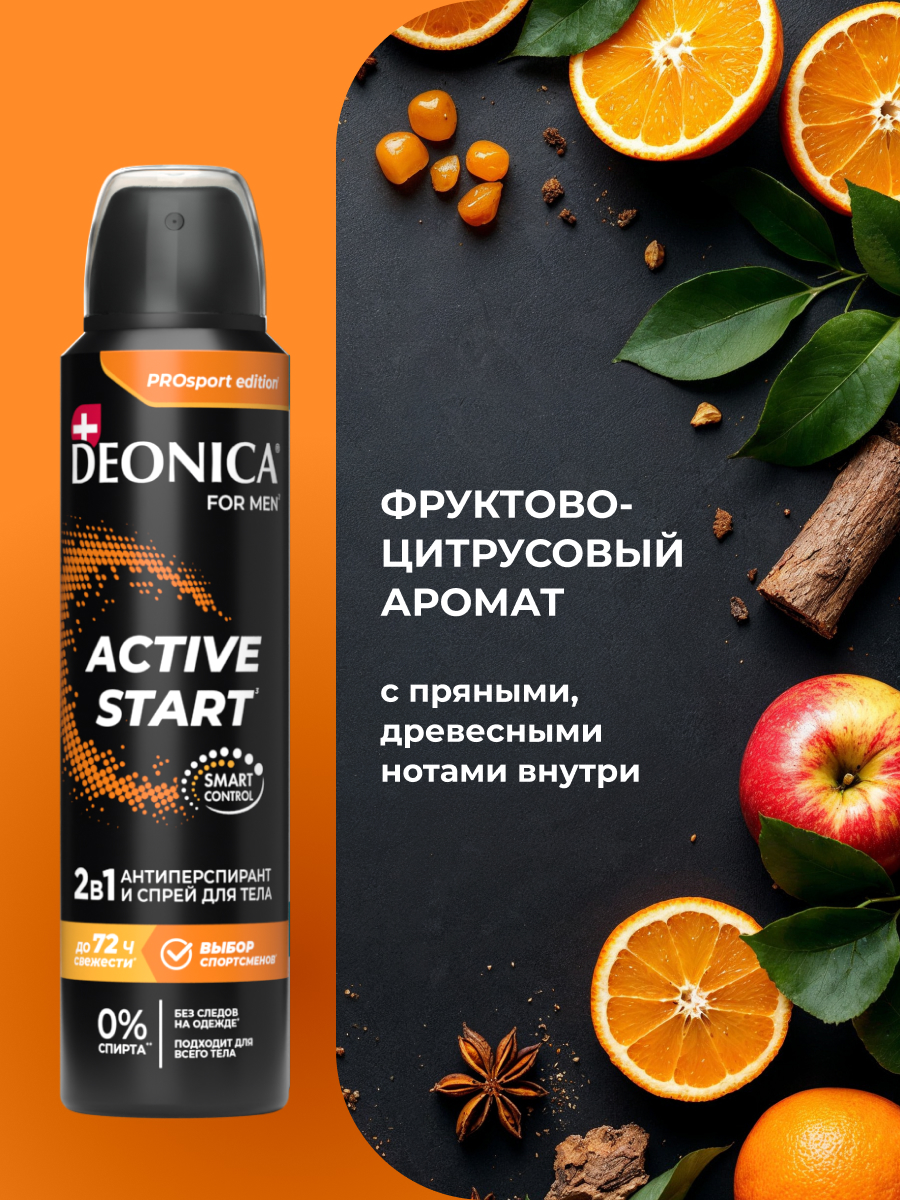 Мужской дезодорант-антиперспирант Deonica Active Start 2в1 создан для тех, кто нуждается в особой высокоэффективной защите при повышенном стрессе и физических нагрузках. Уникальная формула спрея эффективно предотвращает потоотделение и устраняет неприятный запах, даря ощущение свежести до 72 часов. Средство обеспечивает бережный уход не только за кожей подмышек, но и всего тела, делая его безопасным для ежедневного использования. Освежающий аромат открывается сочными нотами фруктов, переходя в пряное сердце на фоне благородных древесных аккордов кедра и пачули. Этот энергичный, но сбалансированный аромат сочетает фруктовую бодрость с мужественной глубиной, идеально подчеркивая уверенность и стиль.