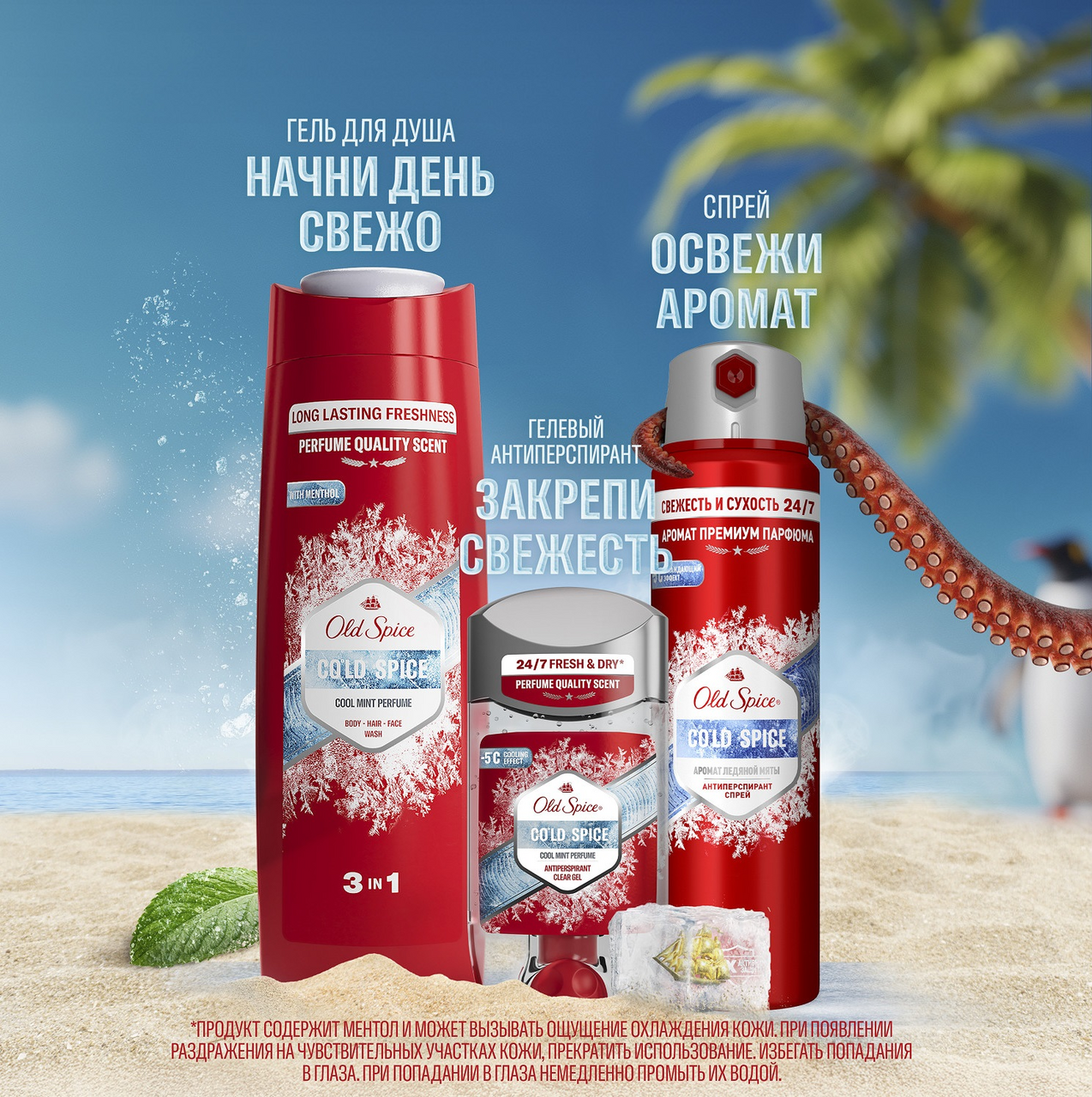 Держитесь, прямо по курсу леденящая свежжжесть. Все мы любим жаркое лето, но сборы на важную встречу в +30С становятся бесполезной затеей - ты только сходил в душ, надел чистую рубашку, а она уже вся мокрая от пота. Но будь уверен, все поправимо с линейкой Cold Spice. Она станет твоим спасением в любой день, требующий свежего перезапуска. Cold Spice не только защищает от пота, но и дарит ощущение холодка на коже, охлаждая твой пыл (но не сердце) с ароматом ледяной мяты. Зарядись бодростью и морррозной свежестью Old Spice с самого утра - попробуй гель для душа+шампунь Cold Spice, затем используй гелевый антиперспирант из той же коллекции, чтобы у пота не осталось шансов. А чтобы освежить аромат в течение дня или перед важным вечерним событием, используй антиперспирант-спрей (только не забудь хорошо встряхнуть.).Преимущества: - Антиперспирант-спрей 150мл - защищает не только от запаха, как дезодоранты, но и от самого пота (влаги); - Эффект мгновенного охлаждения кожи до -5С; - Длительная свежесть и аромат премиум парфюма на весь день.