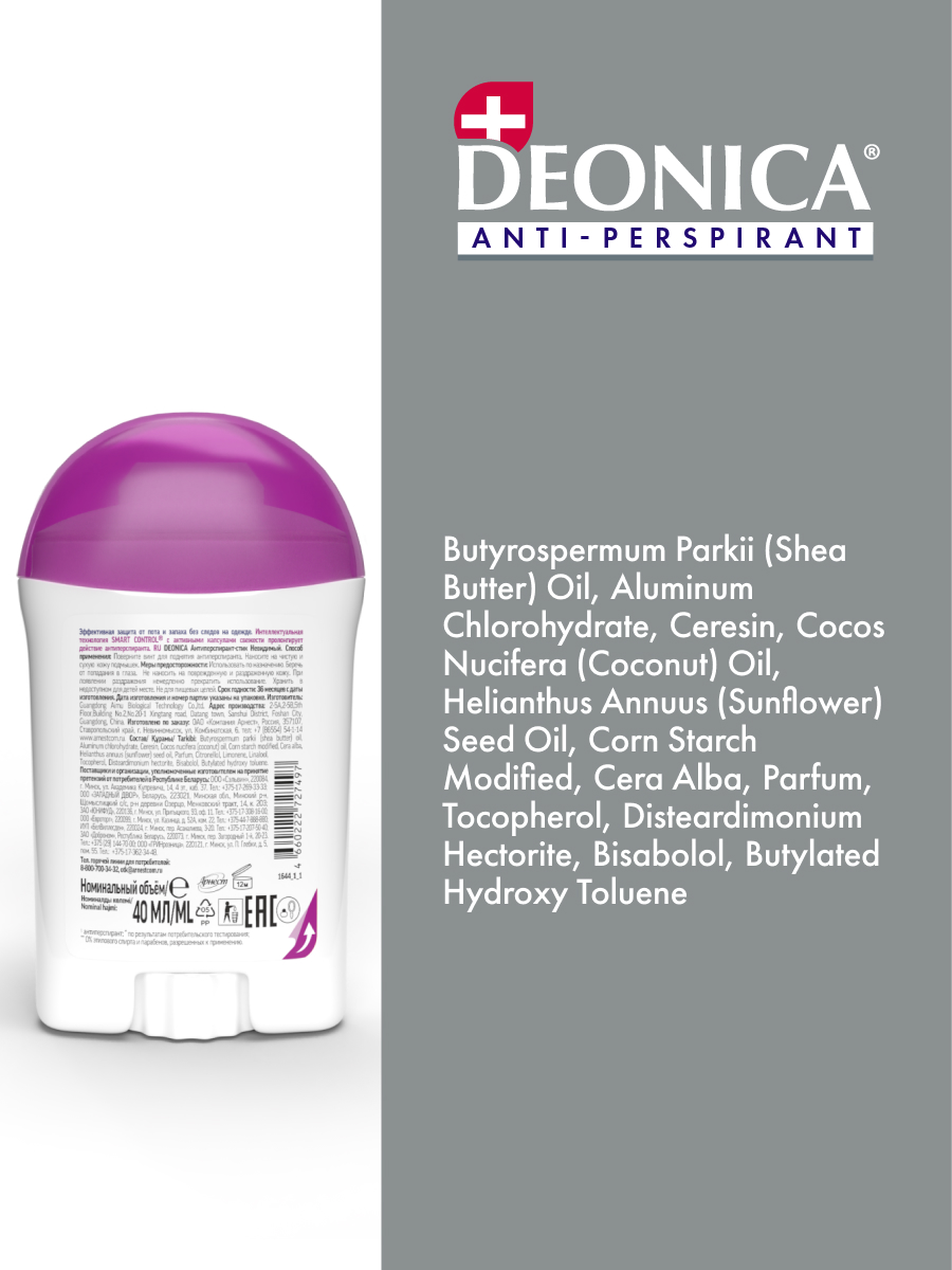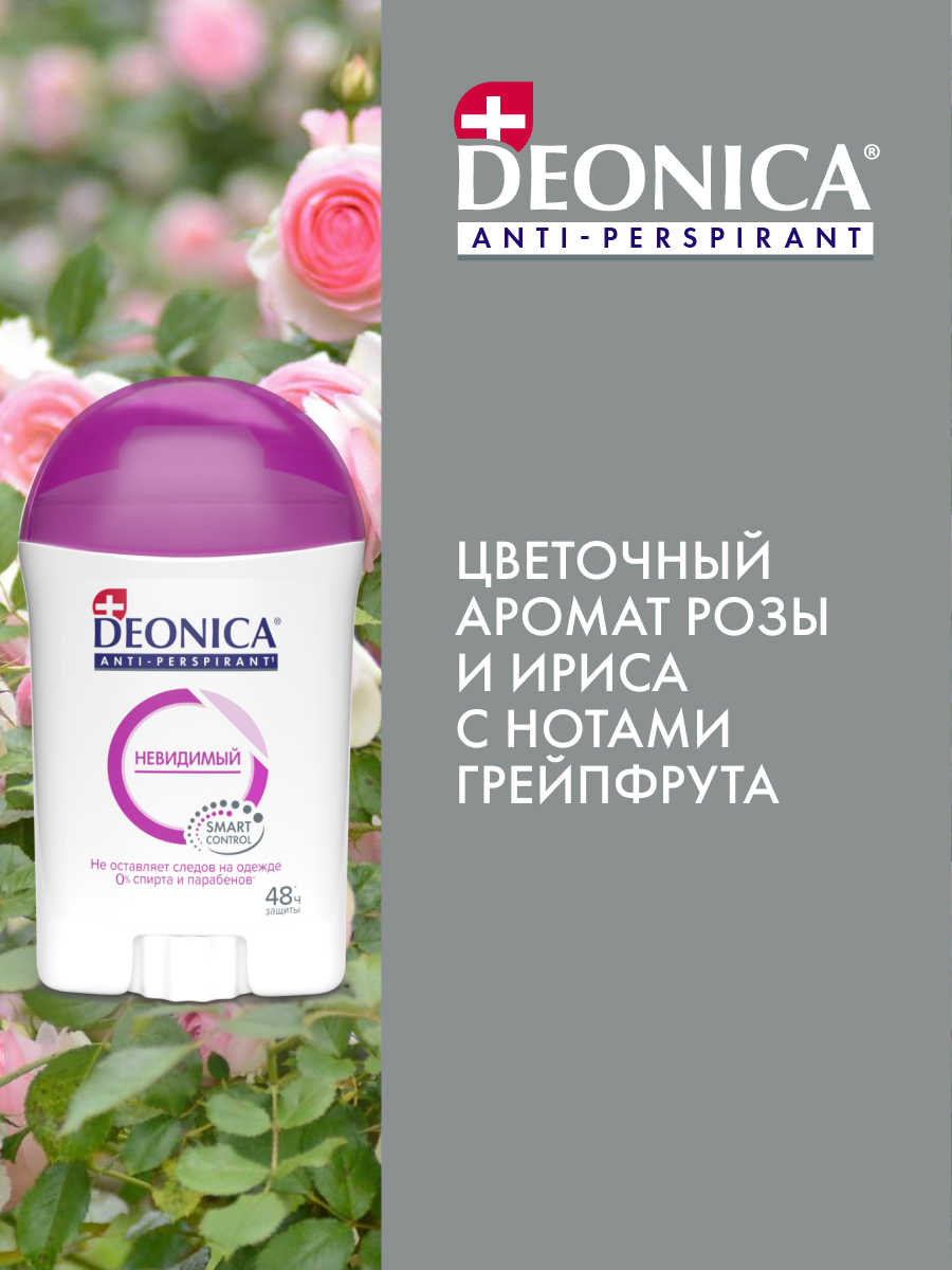С дезодорантом-антиперсперантом Deonica Невидимый вы можете забыть о следах пота и неприятном запахе на 48 часов. Его уникальная формула специально создана для женщин, которые ценят невидимую защиту, свежесть и аккуратность. Средство не оставляет следов на одежде, предотвращает появление неприятных запахов и желтых пятен от пота, делая его идеальным выбором для повседневного использования. Цветочный аромат розы и ириса с нотами грейпфрута не перебьет ваш парфюм, при этом подарит заряд бодрости и хорошего настроения на целый день. Специальная формула с ухаживающим комплексом на основе бисаболола увлажняет и смягчает кожу, помогает справиться с раздражениями. Благодаря своей мягкой натуральной формуле без этилового спирта и парабенов, твердый дезодорант подходит для всех типов кожи, включая чувствительную, не вызывая раздражений и не пересушивая.