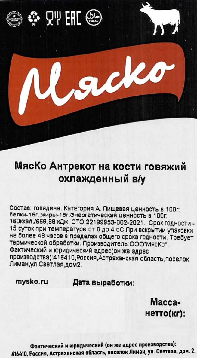 Антрекот говяжий Мяско Халяль на кости охлажденное, ~700г