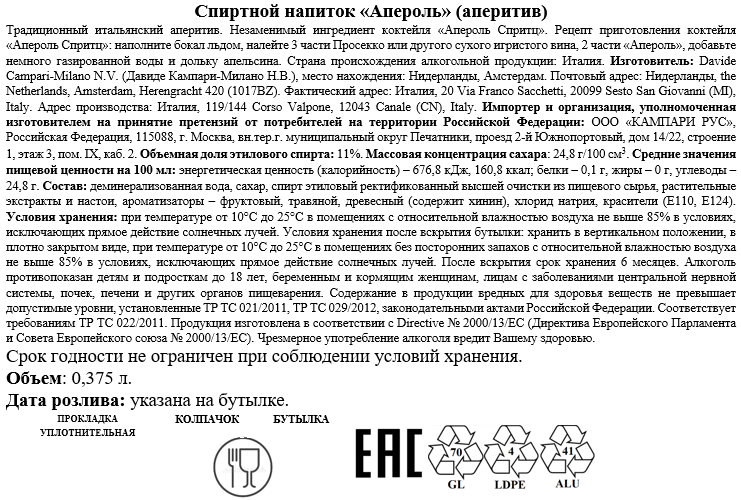 Aperol — итальянский аперитив ярко-оранжевого цвета с уникальным горьковато-сладким вкусом. Состав ингредиентов в рецепте Aperol остается неизменным более 100 лет и до сих пор держится в строжайшем секрете. Легендарный аперитив Aperol был впервые представлен на Международной ярмарке в Падуе в 1919 году. Сегодня Aperol известен во всем мире и занимает почетное место в официальном списке Международной ассоциации барменов (IBA). Он является главным ингредиентом знаменитого итальянского коктейля Aperol Spritz, который завоевал особую популярность в регионе Венето и местных барах бакари, превратившись в неизменный атрибут венецианского стиля жизни. Сейчас Aperol Spritz является одним из самых узнаваемых коктейлей в мире, а благодаря своему легкому, игристому и освежающему ��арактеру он стал ярким символом дружеского общения. Рецепт Aperol Spritz легко повторить в домашних условиях. Наполните бокал льдом, добавьте 3 части просекко, 2 части Aperol и 1 часть газированной воды. Украсьте коктейль долькой апельсина. Aperol Spritz идеально сочетается с брускеттами, суши, разными вариантами тапас и другими закусками из европейской и азиатской кухни.