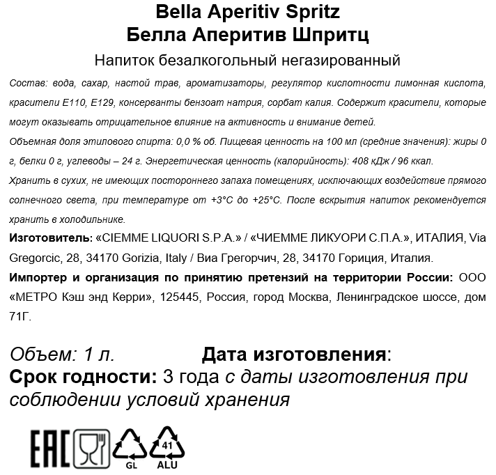 Вода, сахар, настой трав, ароматизаторы, регулятор кислотности лимонная кислота, красители Е110, Е129, консерванты бензоат натрия, сорбат калия.