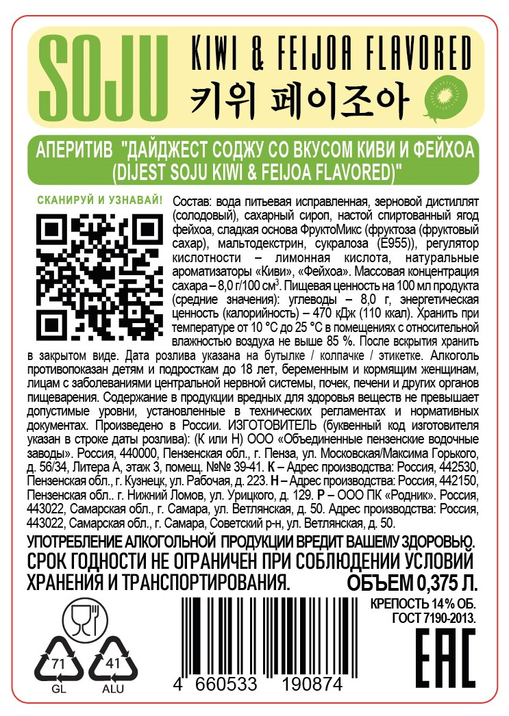 Аперитив Soju Dijest киви и фейхоа, 0.375л