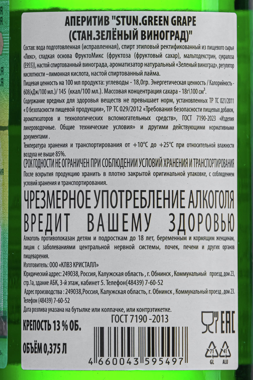 Вода подготовленная (исправленная), спирт этиловый ректификованный из пищевого сырья Люкс, сладкая основа ФруктоМикс (фруктоза (фруктовый сахар), мальтодекстрин, сукралоза (E955)), настой спиртованный винограда, ароматизатор натуральный Зеленый виноград, регулятор кислотности - лимонная кислота, настой спиртованный лайма.