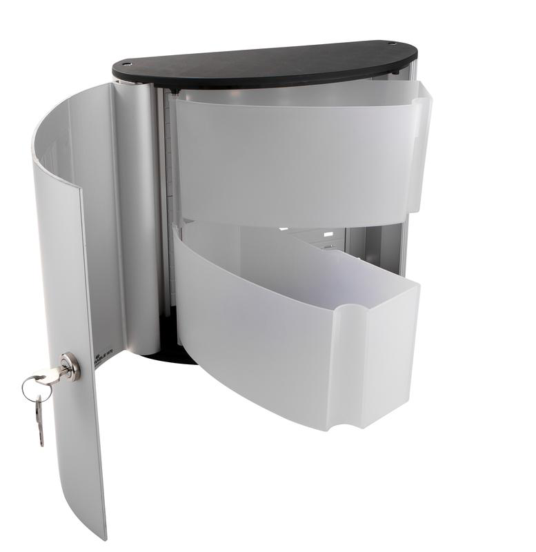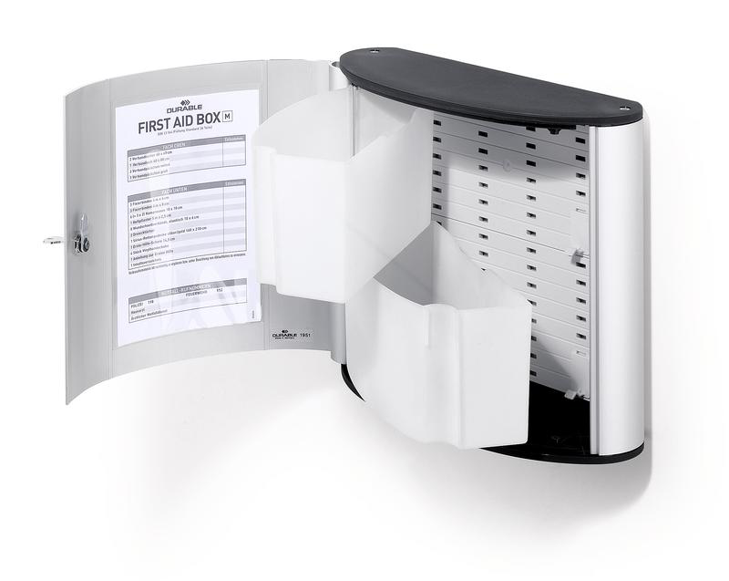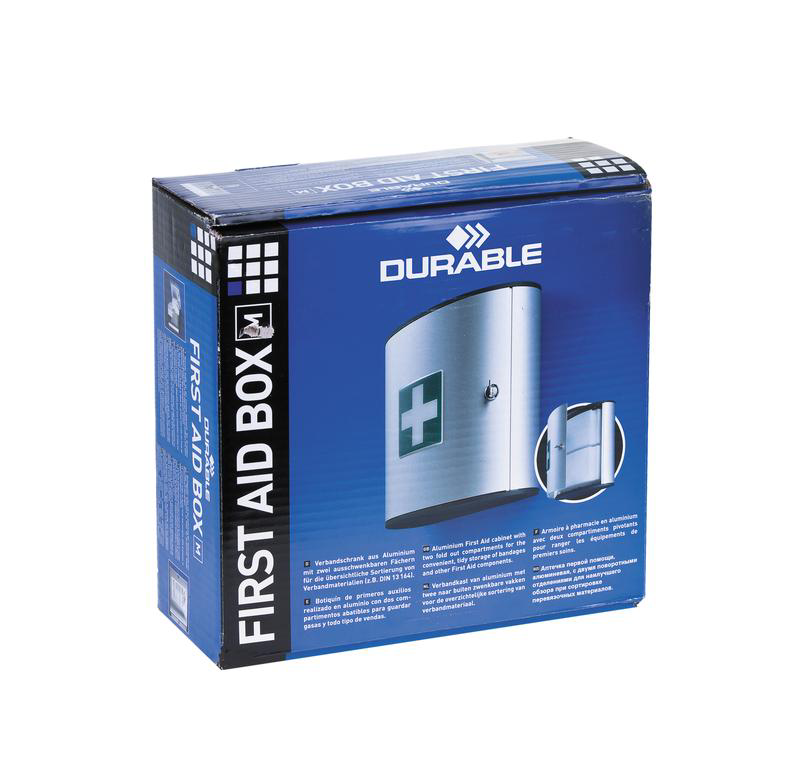 Аптечка настенная из листового алюминия, с 2 лотками для медикаментов. Закрывается на ключ. В комплекте самоклеющийся опознавательный крест. Размер: 302 х 280 х 118 мм. На внутренней стороне дверцы титульный лист для перечня лекарств.