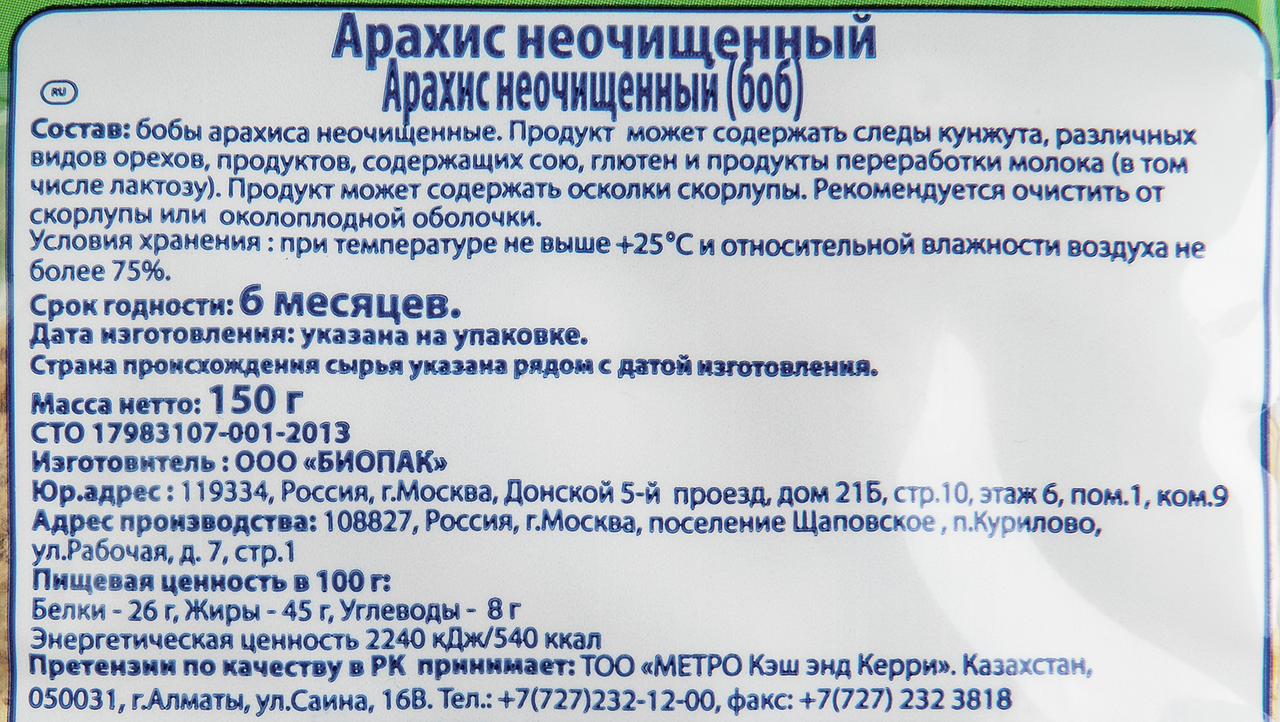 Арахис METRO CHEF неочищенный, 150 г – натуральный продукт, который может использоваться в качестве приятной закуски или для поддержания сил в течение дня. Он представляет собой заключенные в скорлупу плоды культуры семейства бобовых, которую часто называют земляным орехом. Скорлупа у арахиса тонкая и мягкая, ее можно без усилий разламывать прямо руками.Плоды земляного ореха обладают приятным, слегка сладковатым вкусом. В них содержится много полезных для организма компонентов, в число которых входят аминокислоты, фолиевая и лионолевая кислоты, растительные жиры, витамины из группы В, D, А, Е, РР, железо, магний, калий, медь и другие элементы. При регулярном употреблении в пищу арахис оказывает успокаивающее действие на нервную систему, борется с бессонницей и упадком сил, препятствует раннему старению, снижает риск анемии и заболеваний сердца, улучшает мозговую деятельность и повышает иммунитет. Продукт помещен в прозрачный пластиковый пакет и расфасован порционными партиями весом по 150 грамм, которые удобно брать с собой для легкого перекуса.Приобрести арахис METRO CHEF неочищенный, 150 г можно в торговом центре METRO.Состав: ядра бобов арахиса неочищенные. Пищевая ценность: белки 29,7 г, жиры 48 г, углеводы 11 г.Энергетическая ценность: 612 ккал. Вес: 150 г.Упаковка: пластиковый пакет.Условия хранения: хранить в сухом прохладном месте при температуре не выше 25С и относительной влажности воздуха не более 75%. Срок хранения: 12 месяцев при соблюдении условий хранения. Бренд: Metro Chef.Производитель: Metro C&C. Страна-изготовитель: Росс��я.