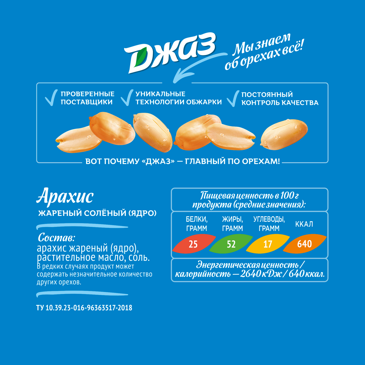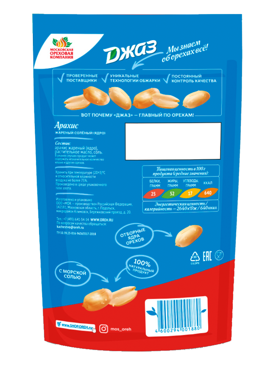 Цельный бразильский арахис сорта Раннер обжаривается с добавлением растительного масла и посыпается морской солью. Уникальная технология обжарки и первоклассное сырье гарантируют неповторимый вкус и сохранение всех полезных веществ. Арахис отлично подойдет и для быстрого перекуса на ходу, и для вечерних посиделок у телевизора, и в качестве закуски к бокалу пива. Фасовка в среде инертного газа предотвращает окисление жареного арахиса и способствует сохранению его вкусовых качеств на протяжении всего срока хранения.