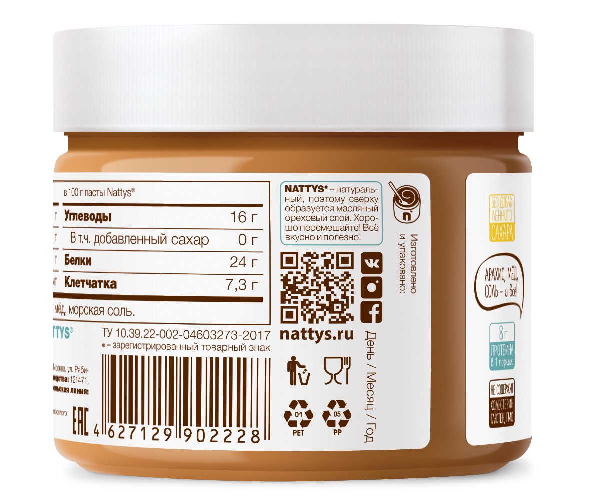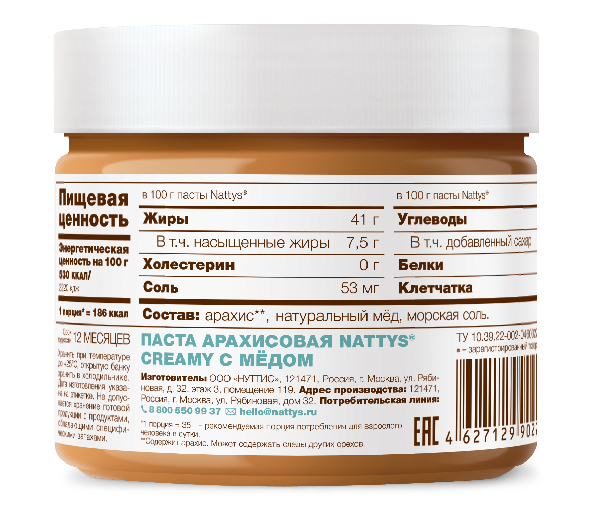 Арахисовая паста-крем NATTYS Creamy с медом, 325 г — уникальный продукт, который является источником растительного белка, полезных жиров, витаминов и минералов. В состав пасты входят только отборный арахис, измельченный до однородной консистенции, натуральный мед и морская соль. Продукт обладает насыщенным ореховым ароматом и изумительным сладко-соленым вкусом. В нем не содержится вредных искусственных добавок: красителей, ароматизаторов, усилителей вкуса и запаха, консервантов, пальмового масла, подсластителей, ГМО.Всего одна ложка арахисовой пасты способна заменить полноценный перекус — она насыщает энергии и дарит долгое чувство насыщения. Ее также можно намазать на хлебцы. Еще арахисовую пасту принято подавать с блинами, оладьями и сырниками, до��авлять в творог и кашу. Продукт богат клетчаткой, благодаря чему улучшает пищеварение и нормализует обмен веществ. Его можно употреблять в пищу спортсменам, людям, придерживающимся диетического и постного питания, а также вегетарианцам. Энергетическая ценность пасты составляет 530 ккал. В 100 г пасты содержится 24 г белка, 41 г жира и 16 г углеводов. Срок годности лакомства составляет 12 месяцев. Открытую упаковку следует хранить в холодильнике. Приобрести арахисовую пасту-крем NATTYS Creamyс медом, 325 г можно в торговом центре METRO.
