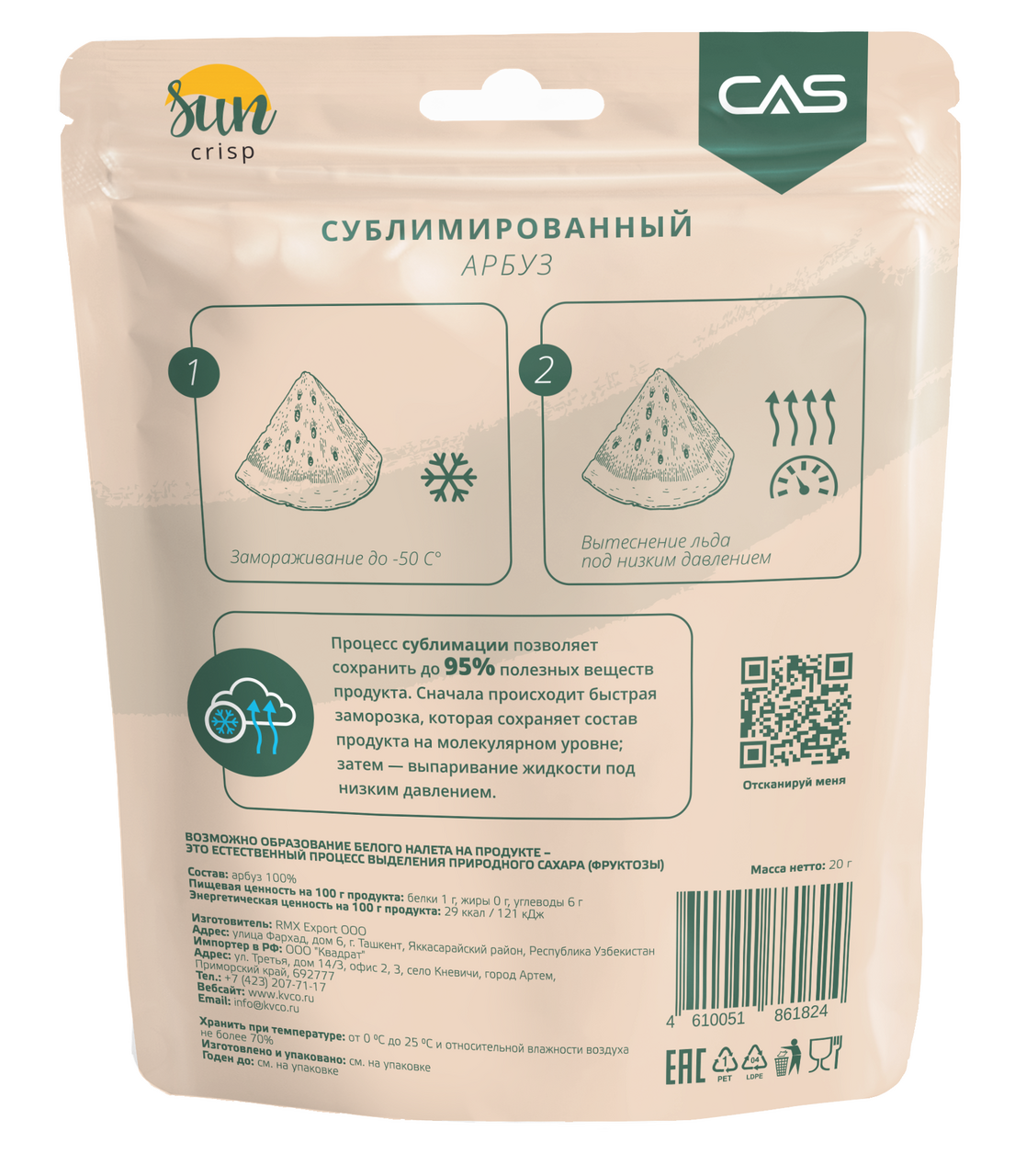 Сублимированный арбуз - это очень полезный и вкусный перекус. Это 100% натуральный продукт без сахара, красителей и добавок. Арбуз сублимированный - это насыщенный вкус сладкого и ароматного арбуза в любое время года. Современная технология позволяет сохранить все питательные вещества, витамины, вкус и запах. При этом не используются абсолютно никакие добавки, как химического, так и натурального происхождения, в том числе и сахар. Сублимация - это процесс, при котором ягоды обезвоживаются вакуумным способом. При этом они сохраняют свою форму, естественный цвет, вкус и аромат, а также витамины и микроэлементы. Содержит максимальное количество витаминов, это вкусный, удобный и полезный перекус. Процесс сублимации позволяет сохранить до 95% полезных веществ фруктов. Сначала происходит быстрая заморозка, которая сохраняет состав продукта на молекулярном уровне; затем выпаривание жидкости под низким давлением.