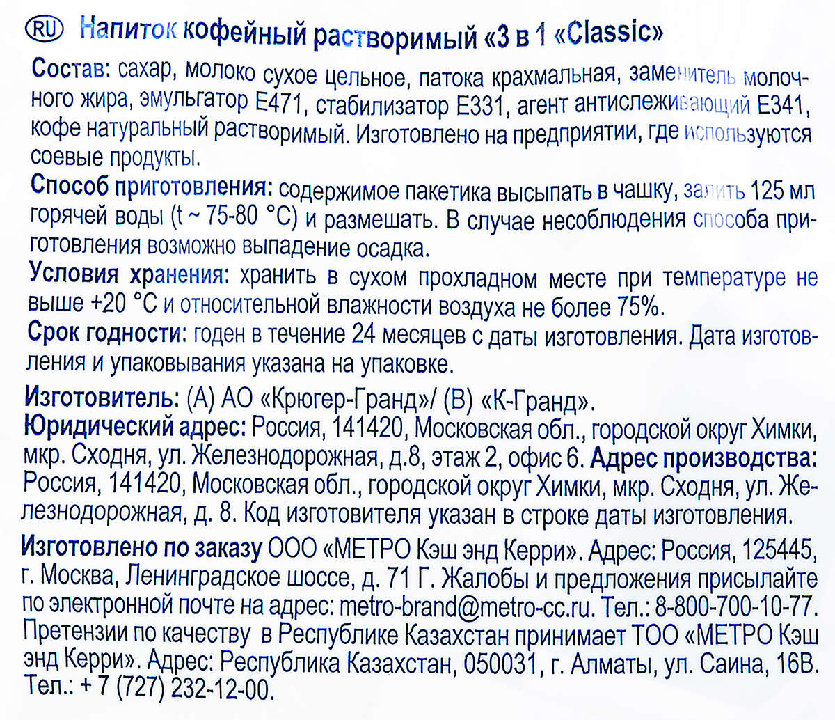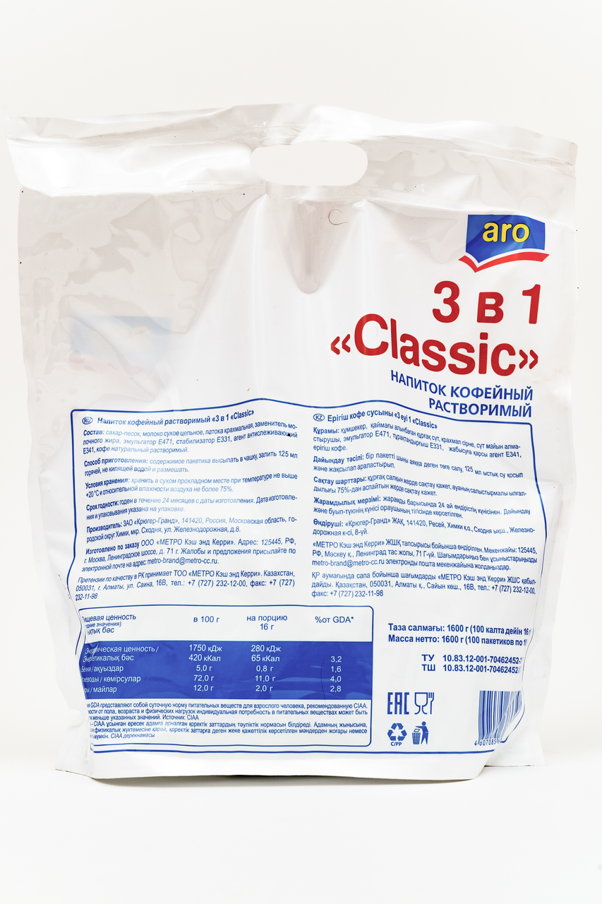 aro Кофе 3в1 классик (100 пакетиков x 16г), 1.6кг