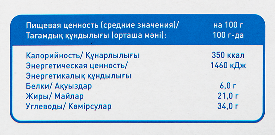 Крем творожный заменитель молочного жира растительные масла пальмовое и его фракции, подсолнечное, антиокислитель концентрат смеси токоферолов, творог обезжиренный молоко обезжиренное пастеризованное, закваска, молоко сухое обезжиренное, вода, загуститель дикрахмалфосфат оксипропилированный, молочный белок, соль, комплексная пищевая добавка загустители каррагинан, дикрахмаладипат ацетилированный, камедь рожкового дерева, эмульгатор моно- и диглицериды жирных кислот, регулятор кислотности лимонная кислота, консервант сорбат калия, песочное печенье мука пшеничная высшего сорта, маргарин растительные масла пальмовое и его фракции, подсолнечное, вода, эмульгатор моно- и диглицериды жирных кислот, соль, краситель каротины, ароматизатор Сливки-молоко, регулятор кислотности лимонная кислота, сахар, вода, сухой яичный меланж, соль, разрыхлитель гидрокарбонат натрия, ароматизатор Ванилин, сахар, вода, сухой яичный меланж, мука пшеничная высшего сорта, пюре лимона, ароматизаторы Сливки, Ванилин, регулятор кислотности лимонная кислота.