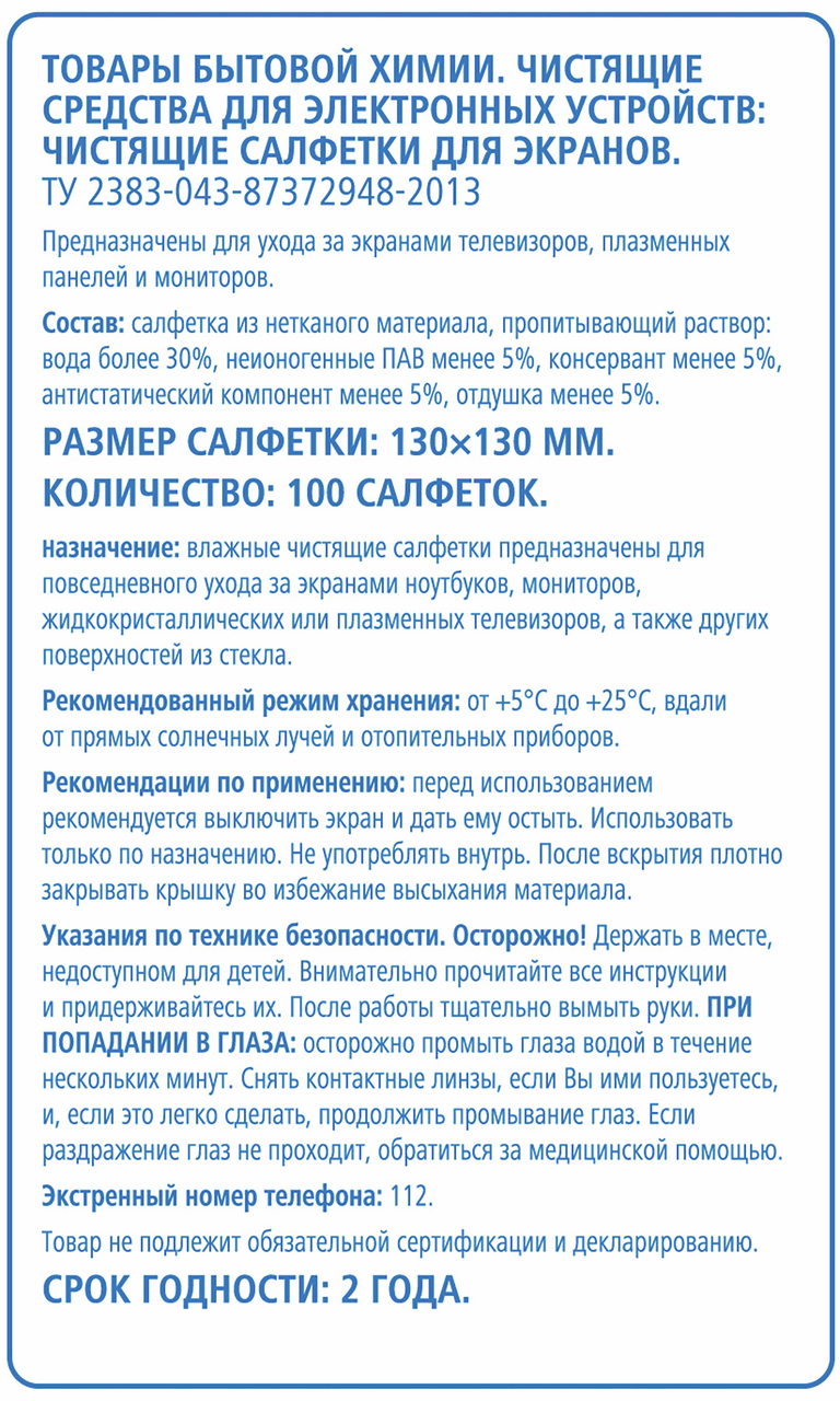 Чистящие салфетки для ухода за экранами телевизоров, плазменных панелей и мониторов, легко удаляют пыль и другие загрязнения. Пропитывающий раствор безопасен для кожи рук. Обладает антистатическим эффектом.