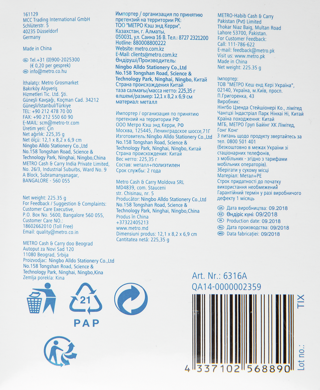 Дырокол aro, 16 листов предназначен для подготовки бумаги к сшиванию. Инструмент используется в офисах и учебных заведениях, также недорогая компактная модель подойдет для дома. Сфера применения: выполнение рефератов, курсовых и дипломных работ; формирование дел, отчетов и подшивок. На механизм, выполненный из металла, предоставляется гарантия в два года. Устройство поставляется в корпусе из прочного пластика. Изделие создает усилие, достаточное для пробивания 16 страниц одновременно. Расстояние между двумя отверстиями составляет 80 мм. Обработанные таким образом листы легко размещаются в папках-скоросшивателях. Продукт произведен под собственной торговой маркой METRO, что позволяет снизить расходы на продвижение и сделать конечную цену на изделие более привлекательной. Компания осуществляет полный контроль за качеством выпускаемого товара, а также учитывает пожелания и замечания покупателей.