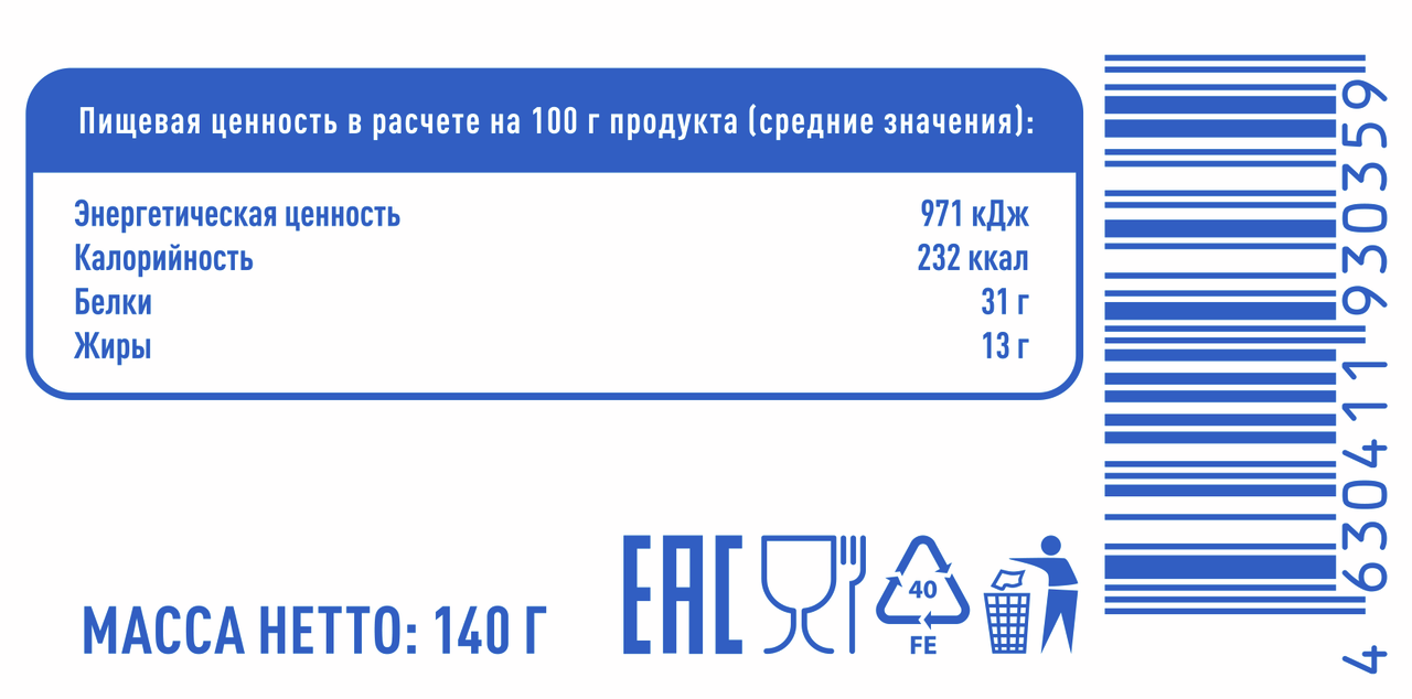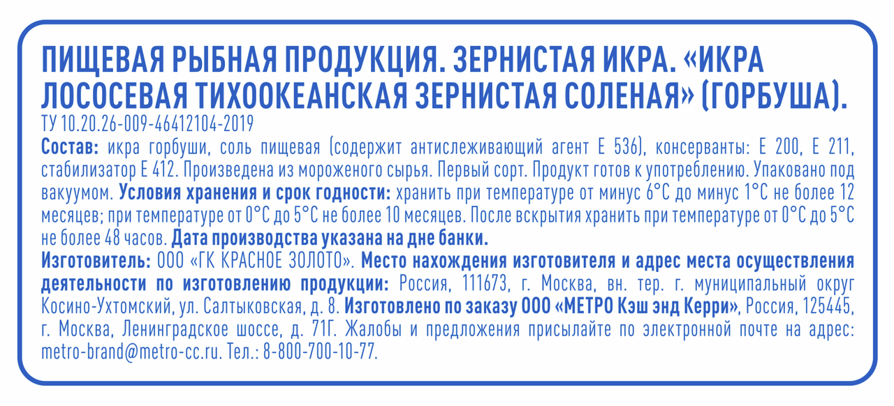 Икра горбуши, соль пищевая (содержит антислеживающий агент Е 536), консерванты: Е 200, Е 211, стабилизатор Е 412. Произведена из мороженого сырья. Первый сорт.
