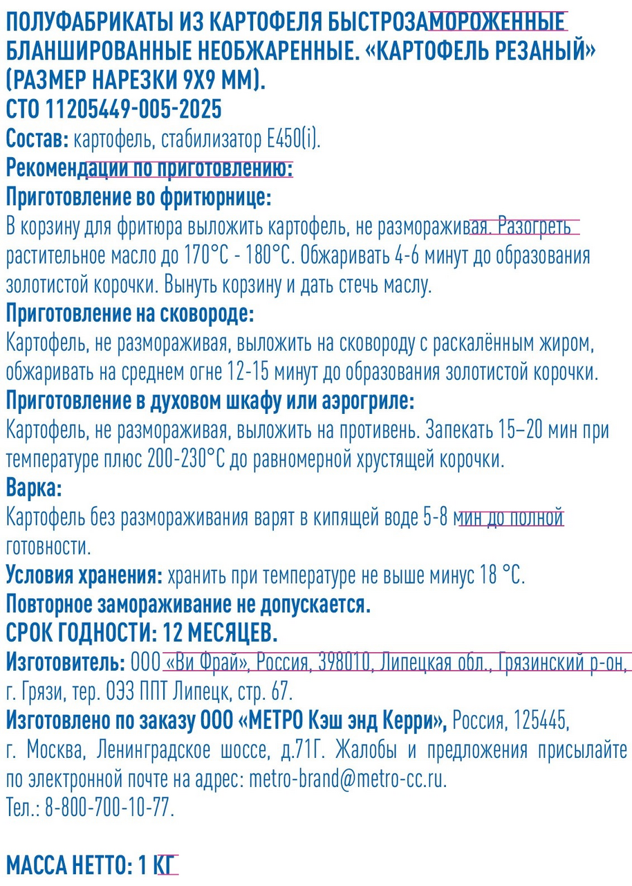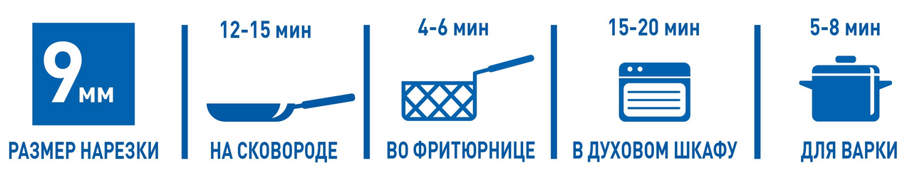 Резаный картофель универсален для любых целей. Его можно жарить, варить, запекать и даже готовить во фритюре. Приготовление во фритюрнице: В корзину для фритюра выложить картофель, не размораживая. Разогреть растительное масло до 170С-180С. Обжаривать 4-6 минут до образования золотистой корочки. Вынуть корзину и дать стечь маслу. Приготовление на сковороде: Картофель, не размораживая, выложить на сковороду с раскалённым жиром, обжаривать на среднем огне 12-15 минут до образования золотистой корочки. Приготовление в духовом шкафу или аэрогриле: Картофель, не размораживая, выложить на противень. Запекать 15-20 мин при температуре плюс 200-230С до равномерной хрустящей корочки. Варка: Картофель без размораживания варят в кипящей воде 5-8 мин до полной готовности. Есть сертификат Халяль.