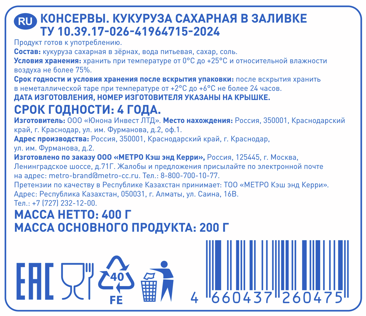 Натуральные кукурузные зерна с добавлением соли, сахара и воды. Для производства используются початки, выращенные на плодородных землях Краснодарского края. Кукуруза послужит основой для множества аппетитных блюд или станет вкусным и полезным дополнением к гарниру.